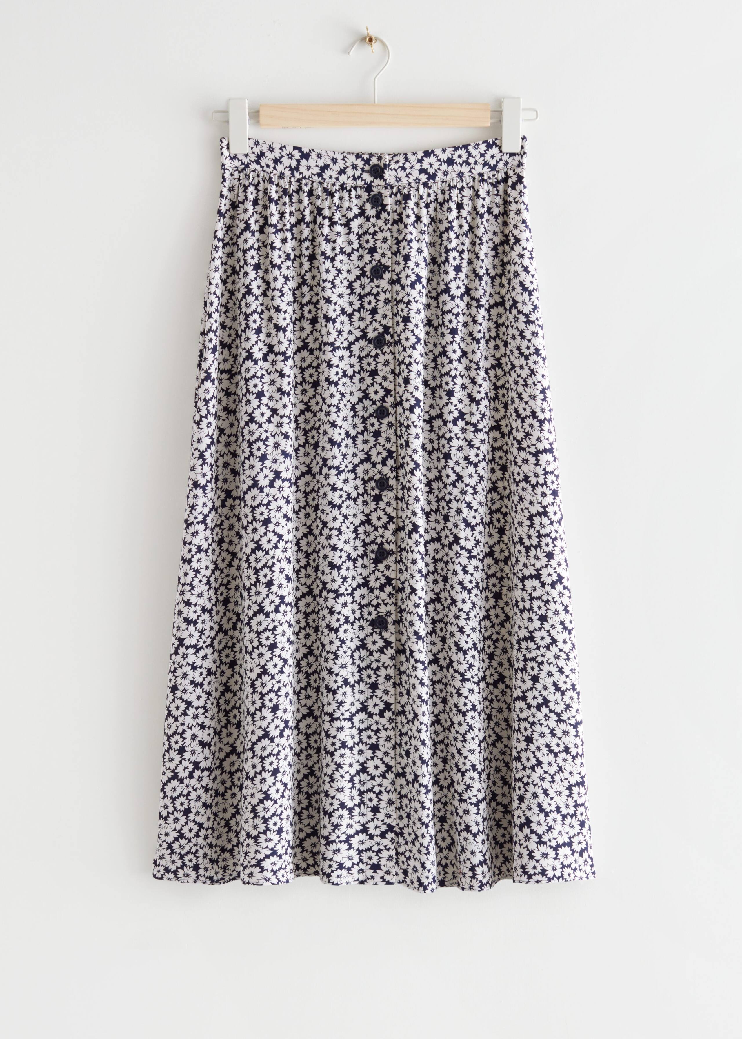 Bedruckter und geknöpfter Midirock mit fließender Silhouette.