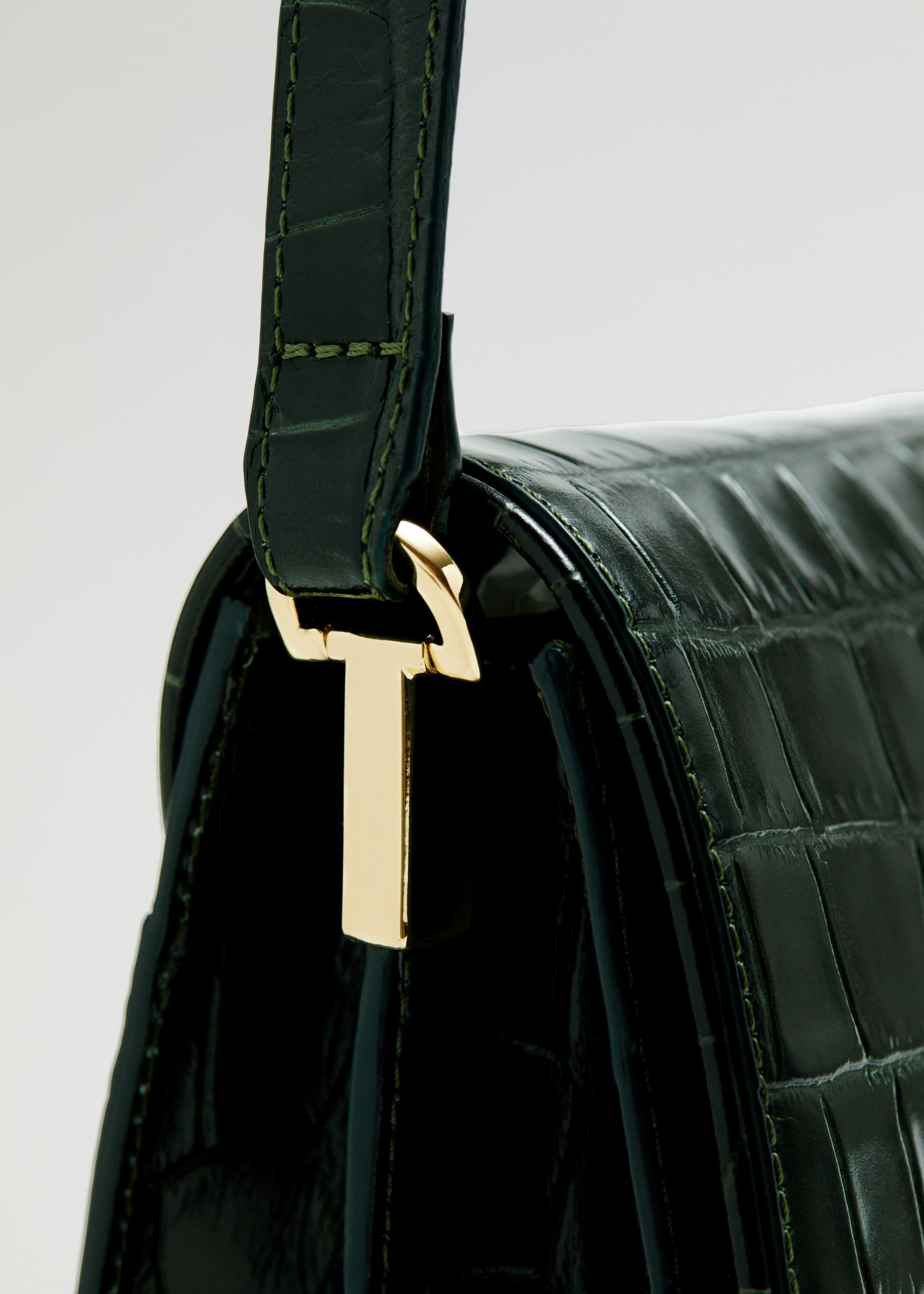 Umhängetasche aus Leder mit Krokoprägung. Sie ist mit drei Innenfächern versehen, eines davon mit Reißverschluss. Den Abschluss bilden der goldfarbene Karabinerverschluss und der verstellbare Schulterriemen.
