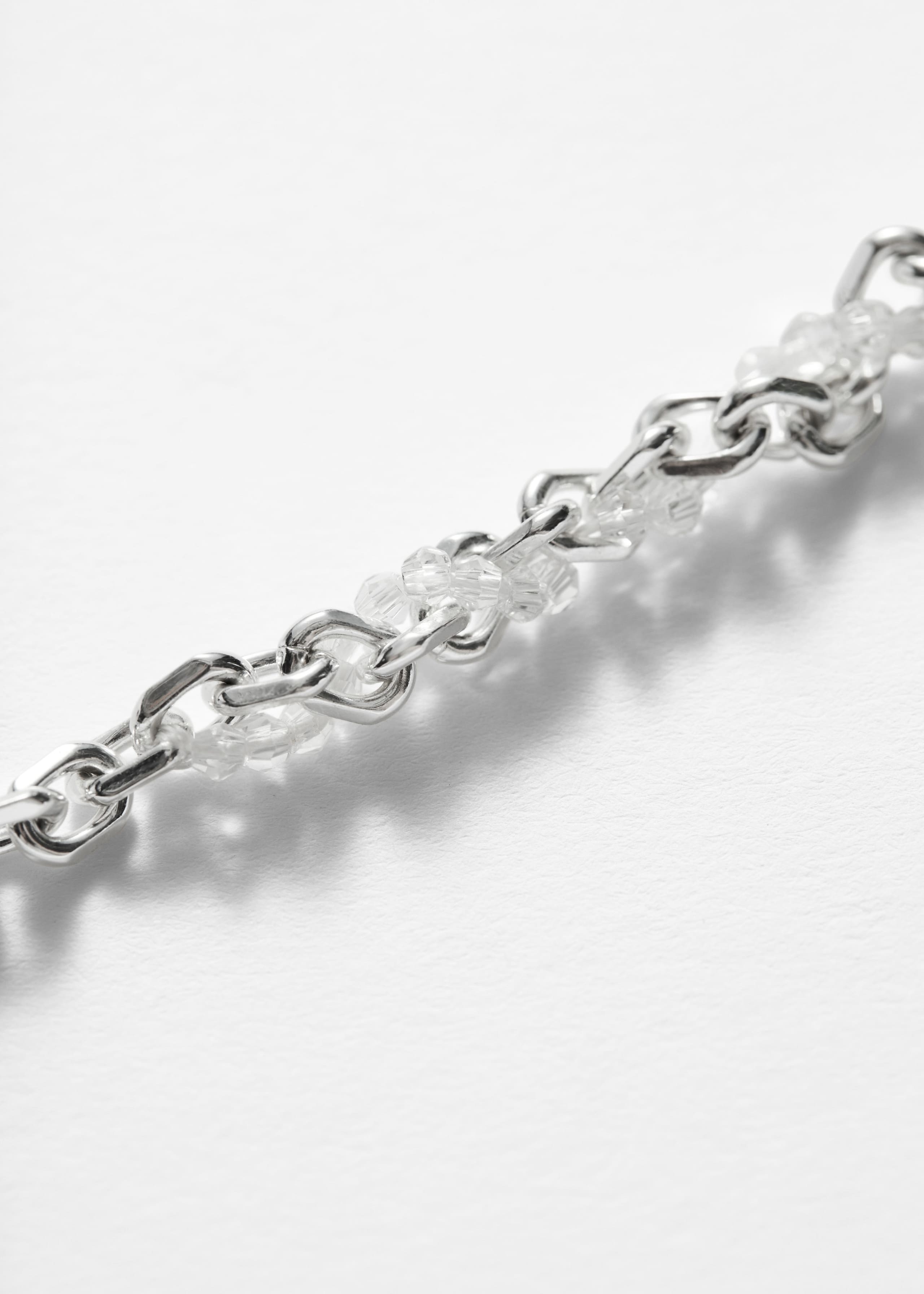 Diese zartgliedrige Halskette aus silberfarbenem Messing ist mit schimmernden Glasperlen verziert. Sie hat eine Verlängerungskette, mithilfe derer Sie die Länge individuell anpassen können.