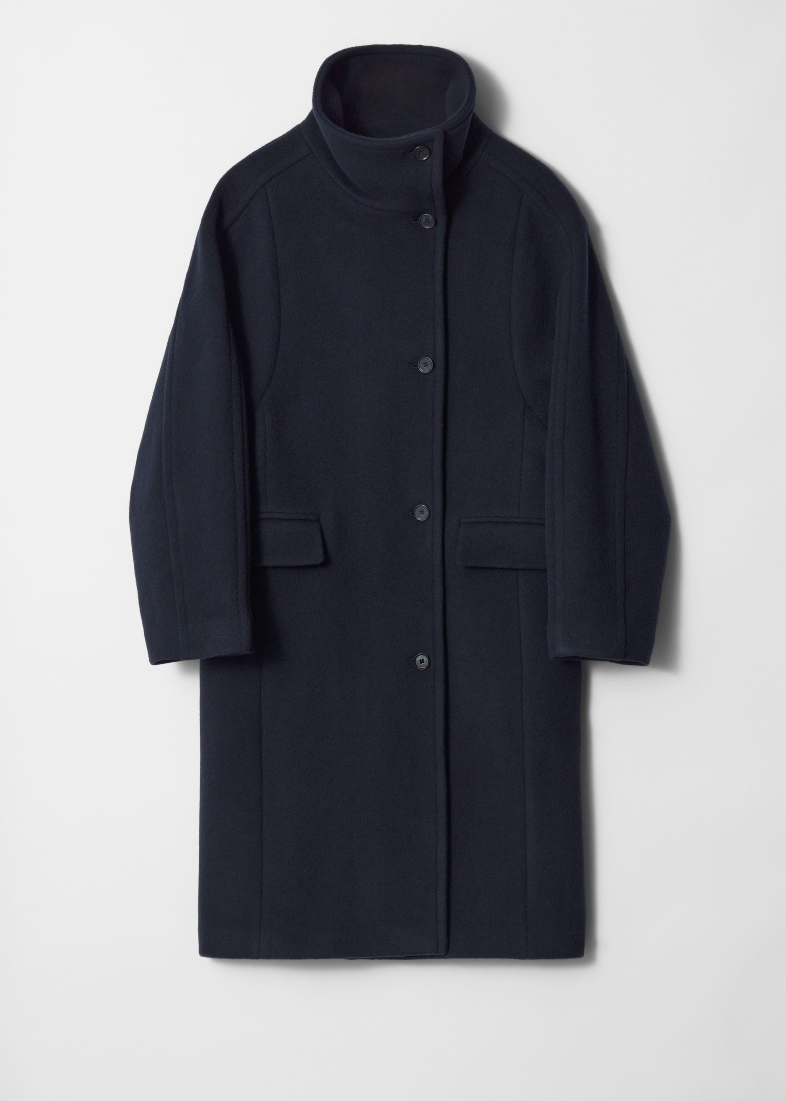 Mittellanger einreihiger Mantel aus einer Wollmischung. Das Modell verfügt über einen Tunnelkragen, ein überlappendes Revers und zwei Pattentaschen vorne.