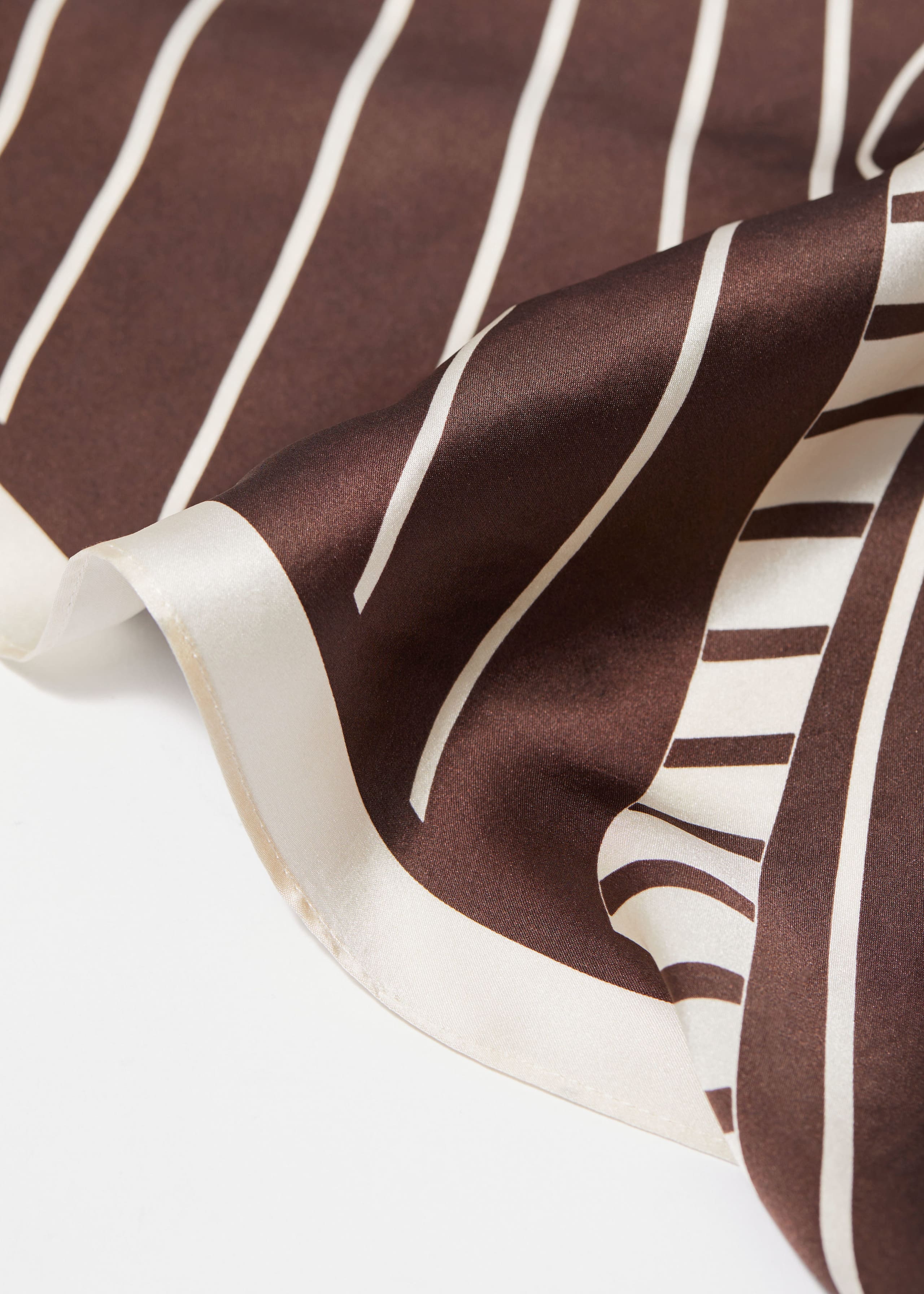 Es gibt so viele Möglichkeiten, ein Seidentuch zu stylen – als Kopfbedeckung, um den Hals geknotet oder an den oberen Griffen deiner Lieblingstasche. Dieses Tuch ist aus Maulbeerseide gefertigt und mit einem grafischen Motiv bedruckt.