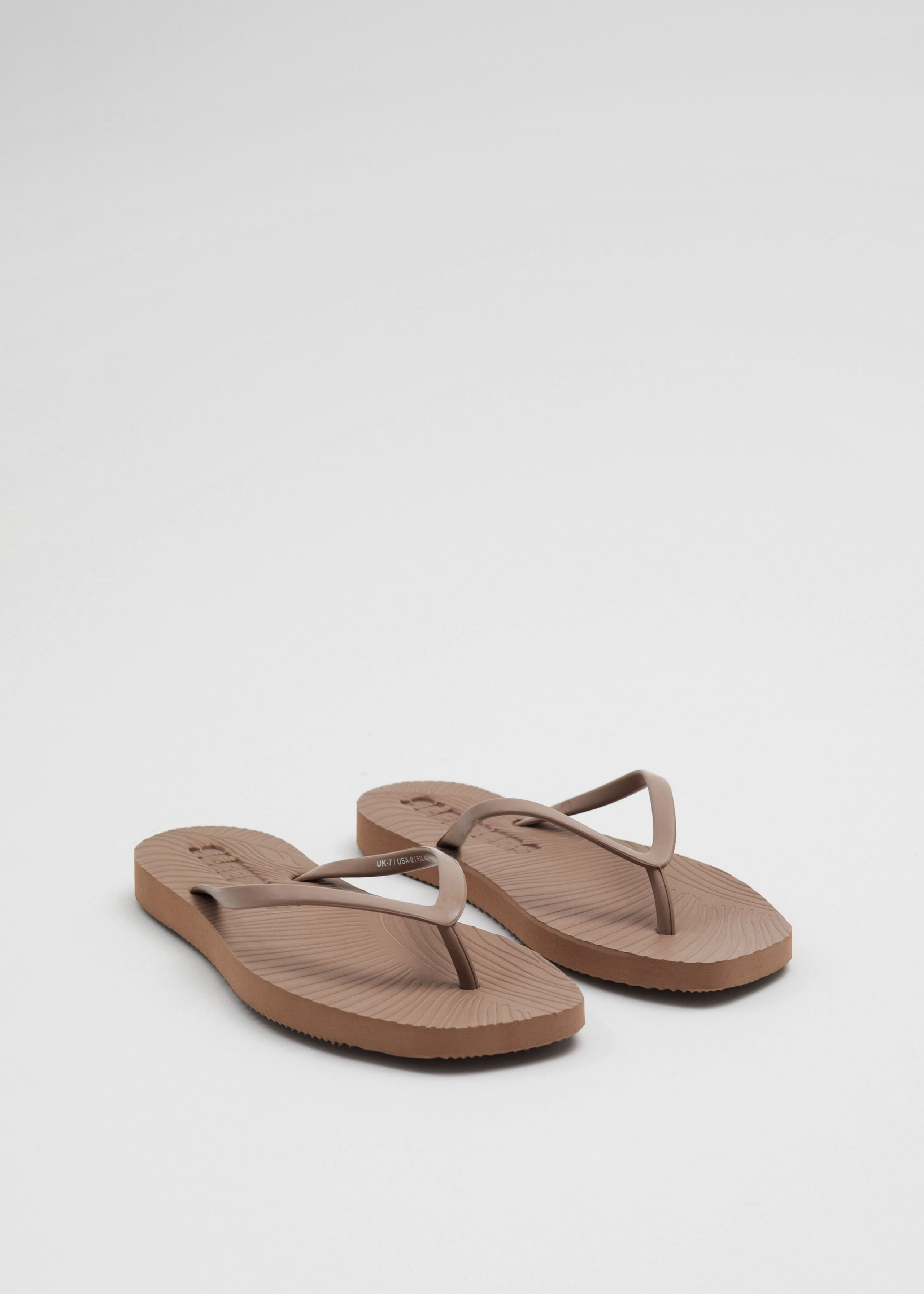 Flip-Flops von Sleepers. Quadratische Form mit leicht konstruierter Sohle und einem schmalen Riemen aus hochwertigem Naturkautschuk.