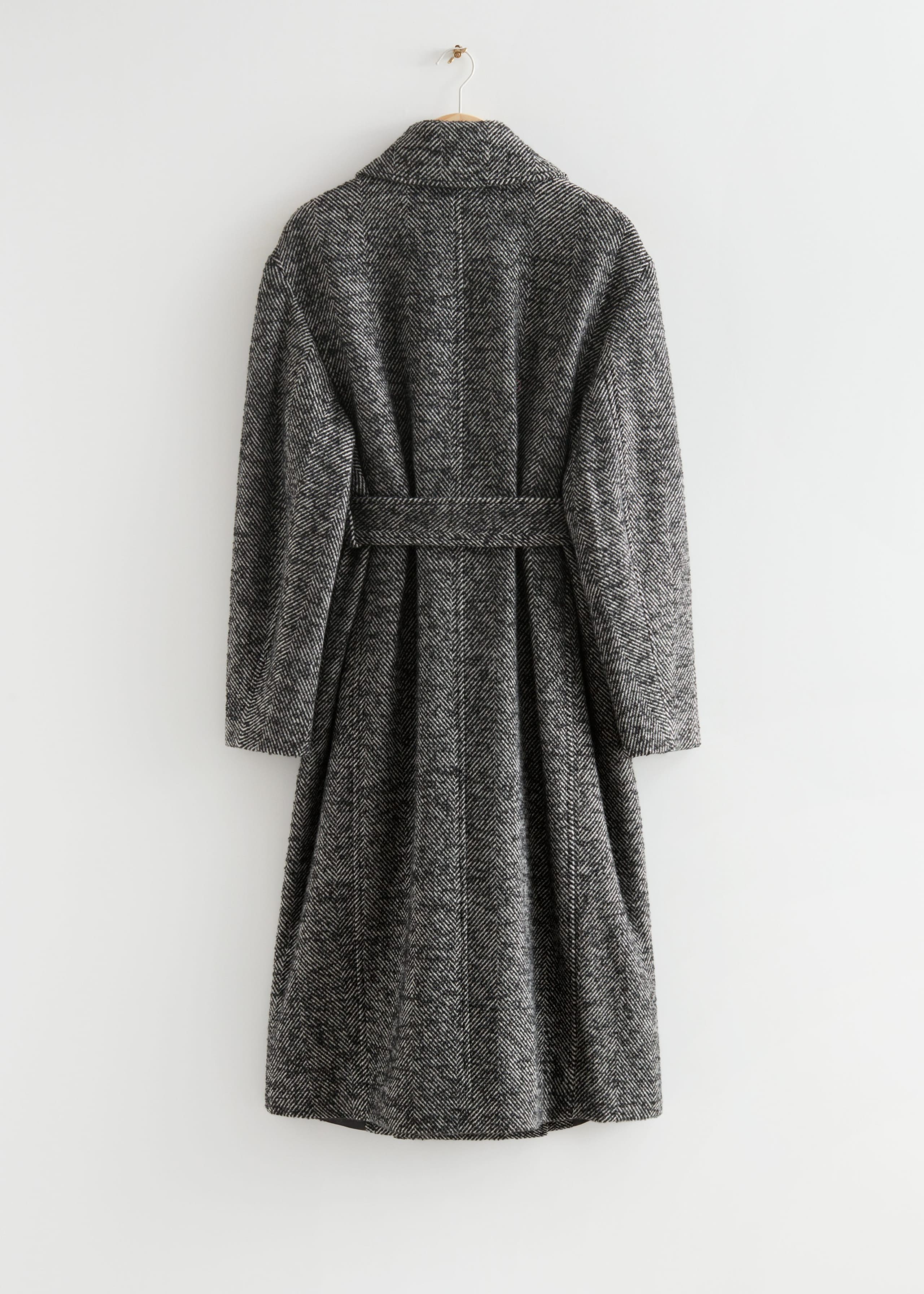 Voluminöser Wollmantel mit überlappendem Revers und farblich passendem Bindegürtel.