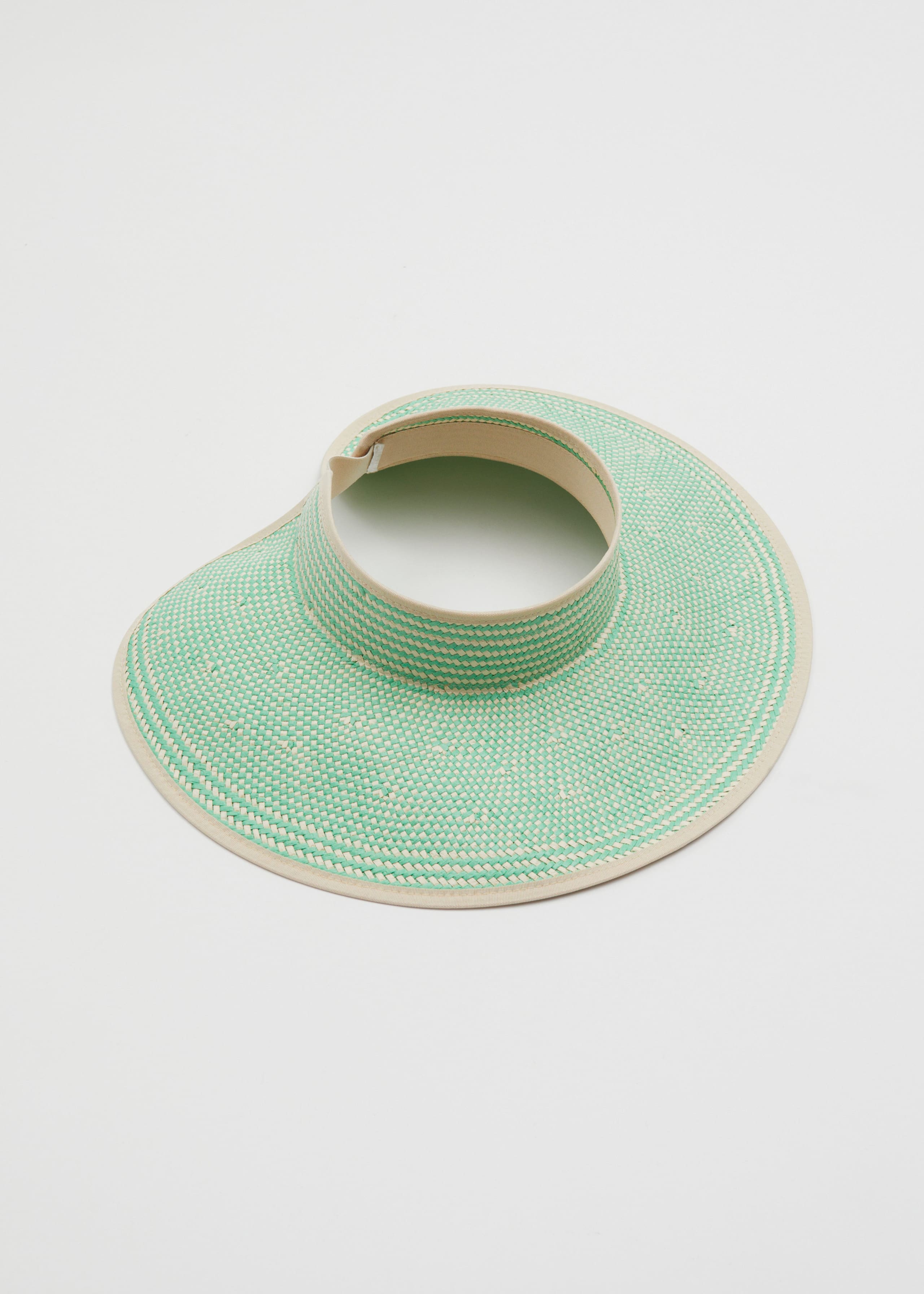 Sonnenvisier aus leichtem, zweifarbigem geflochtenem Stroh, mit Ripsband besetzt und mit einem elastischen, farblich abgestimmten Kopfband versehen.