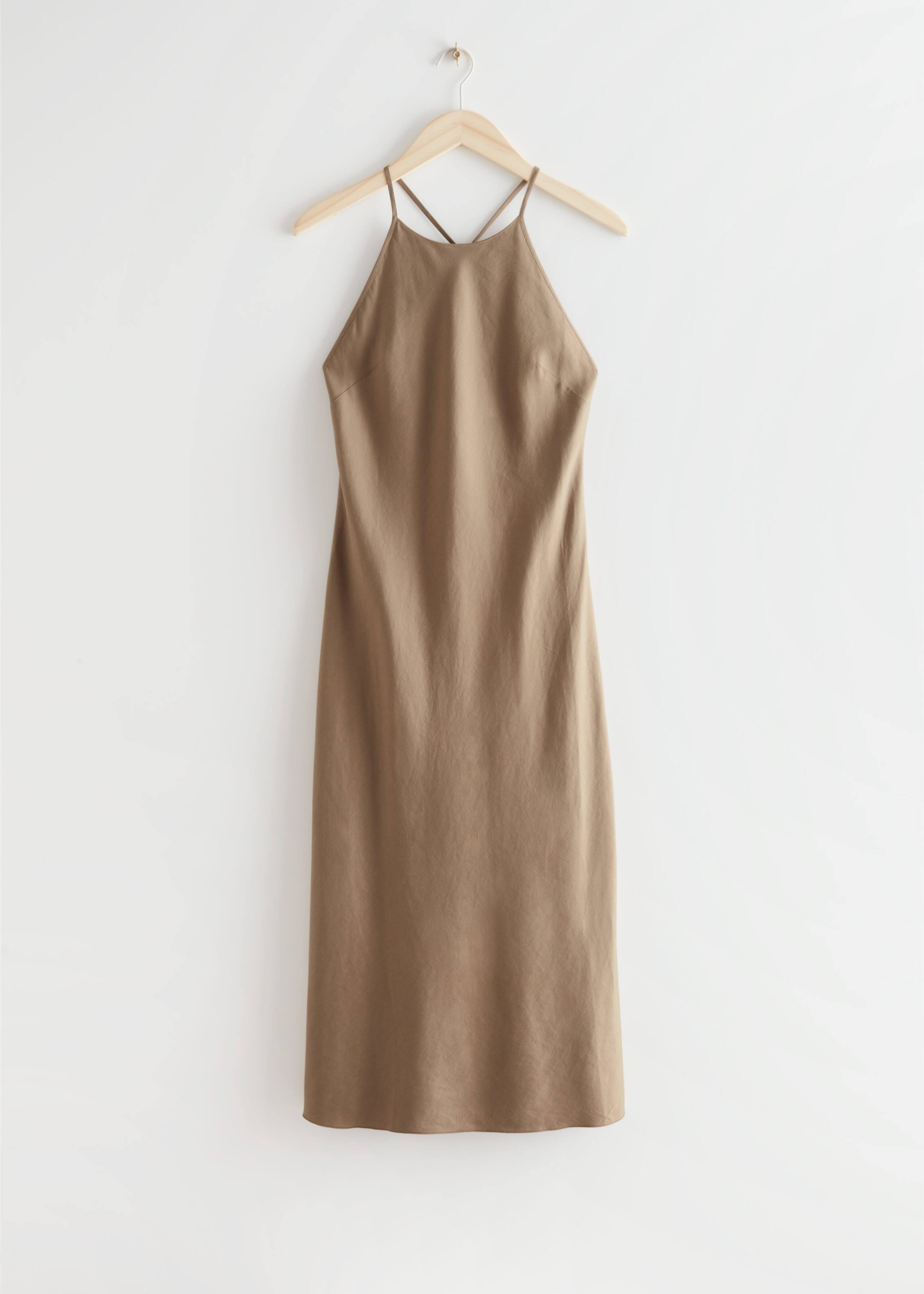 Ärmelloses Midikleid mit im Rücken gekreuzten Spaghettiträgern.