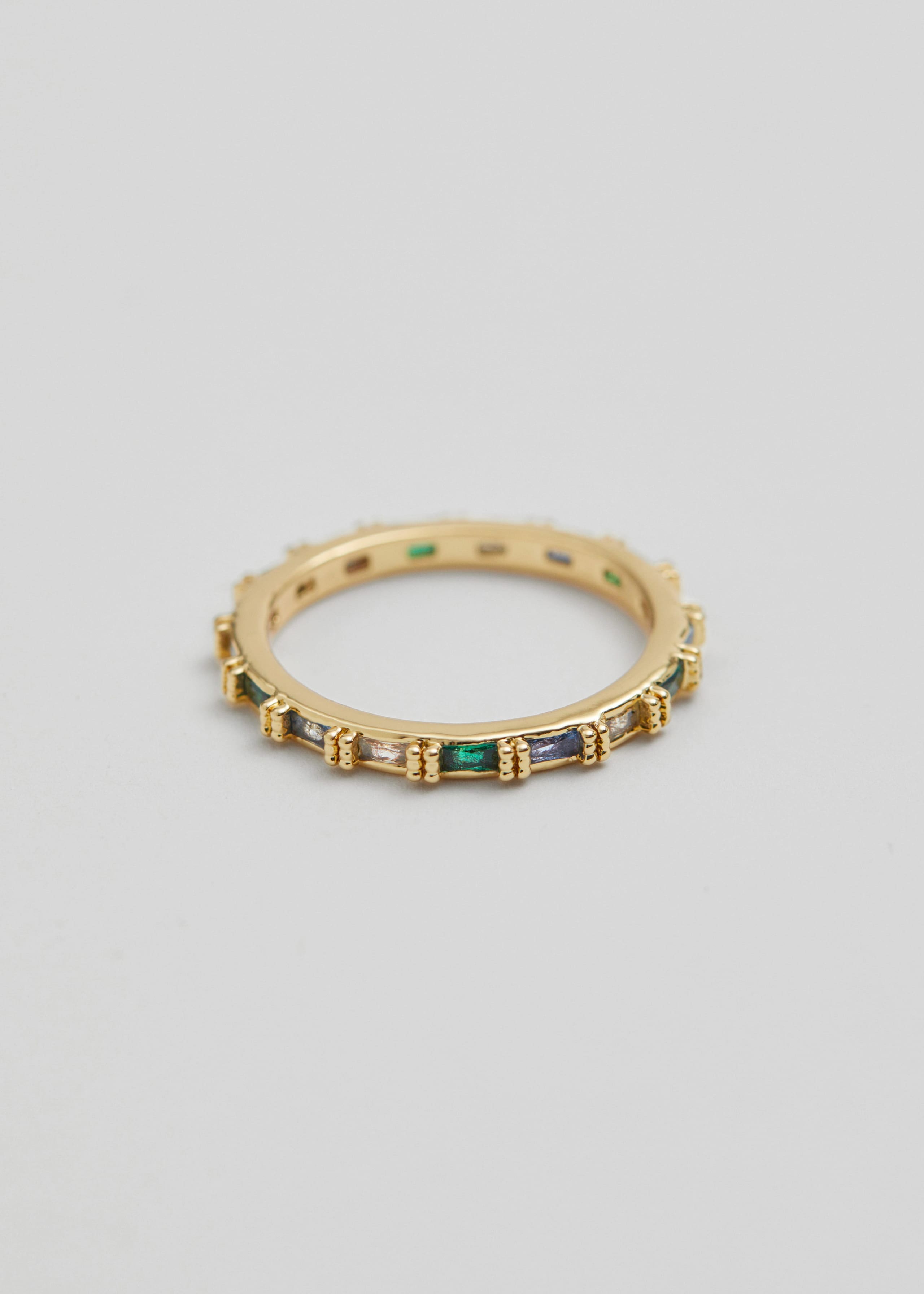 Zarter goldfarbener Ring mit mehrfarbigen eckigen Ziersteinen.