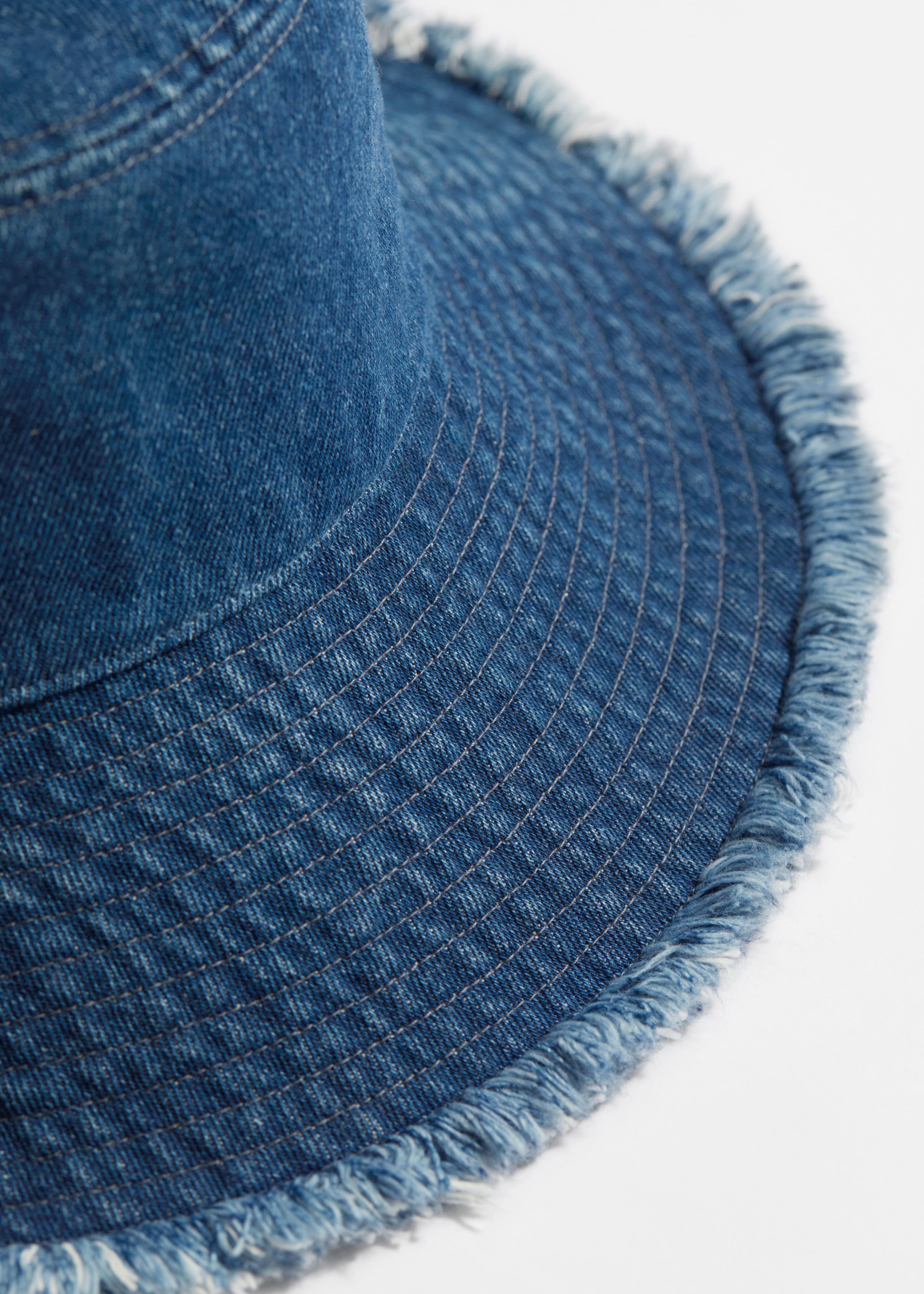 Klassischer Fischerhut aus griffigem Baumwoll-Denim mit Steppnähten und ausgefransten Kanten.