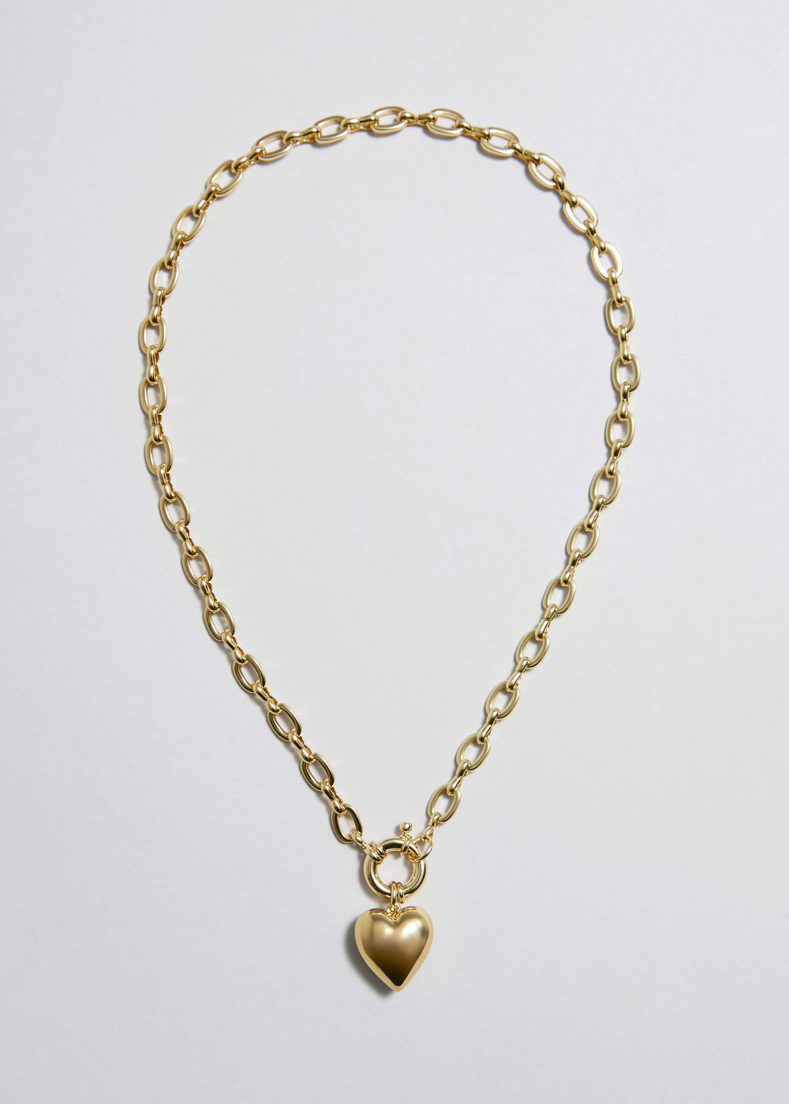 Goldfarbene Gliederhalskette mit dekorativem Herzanhänger.