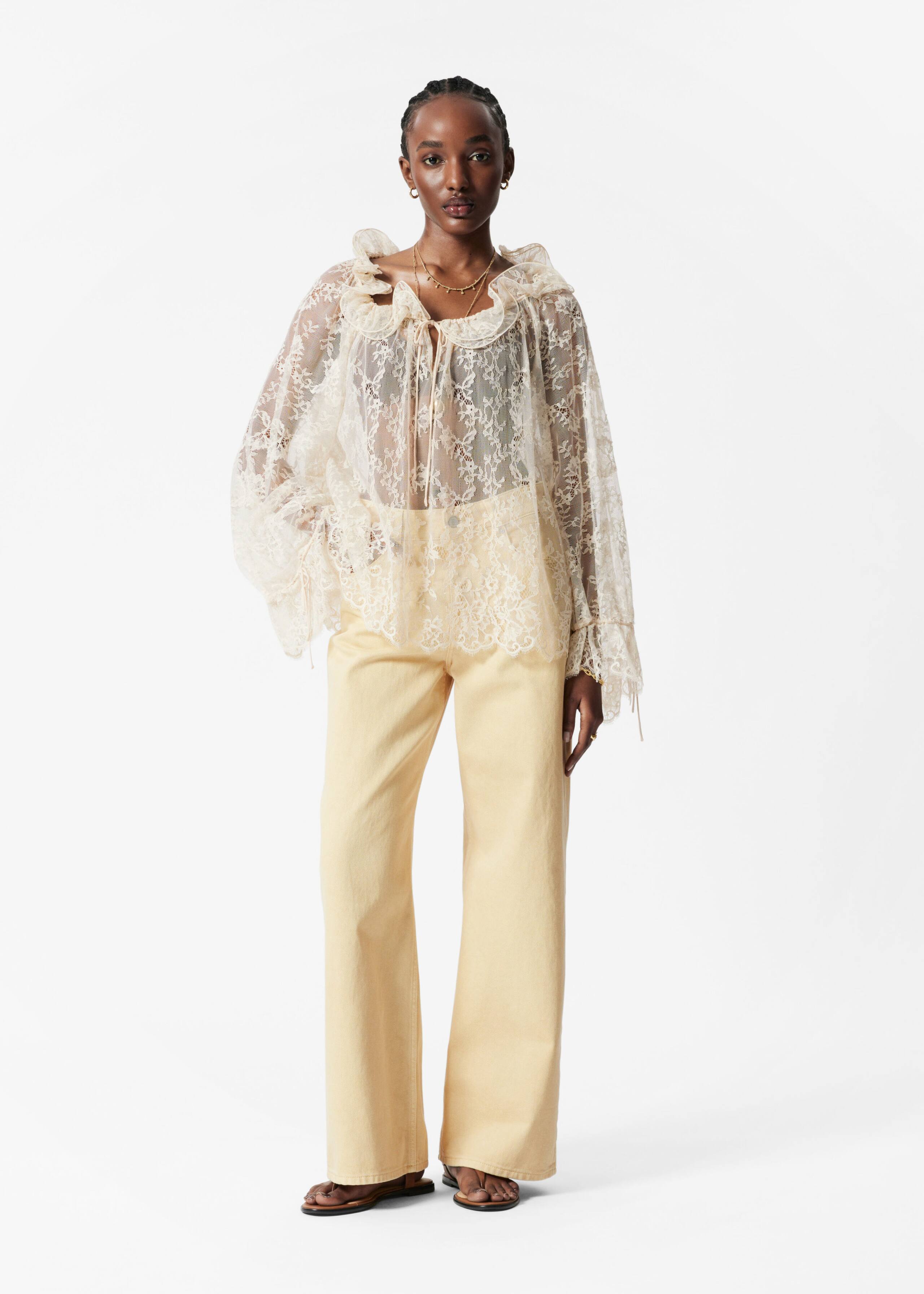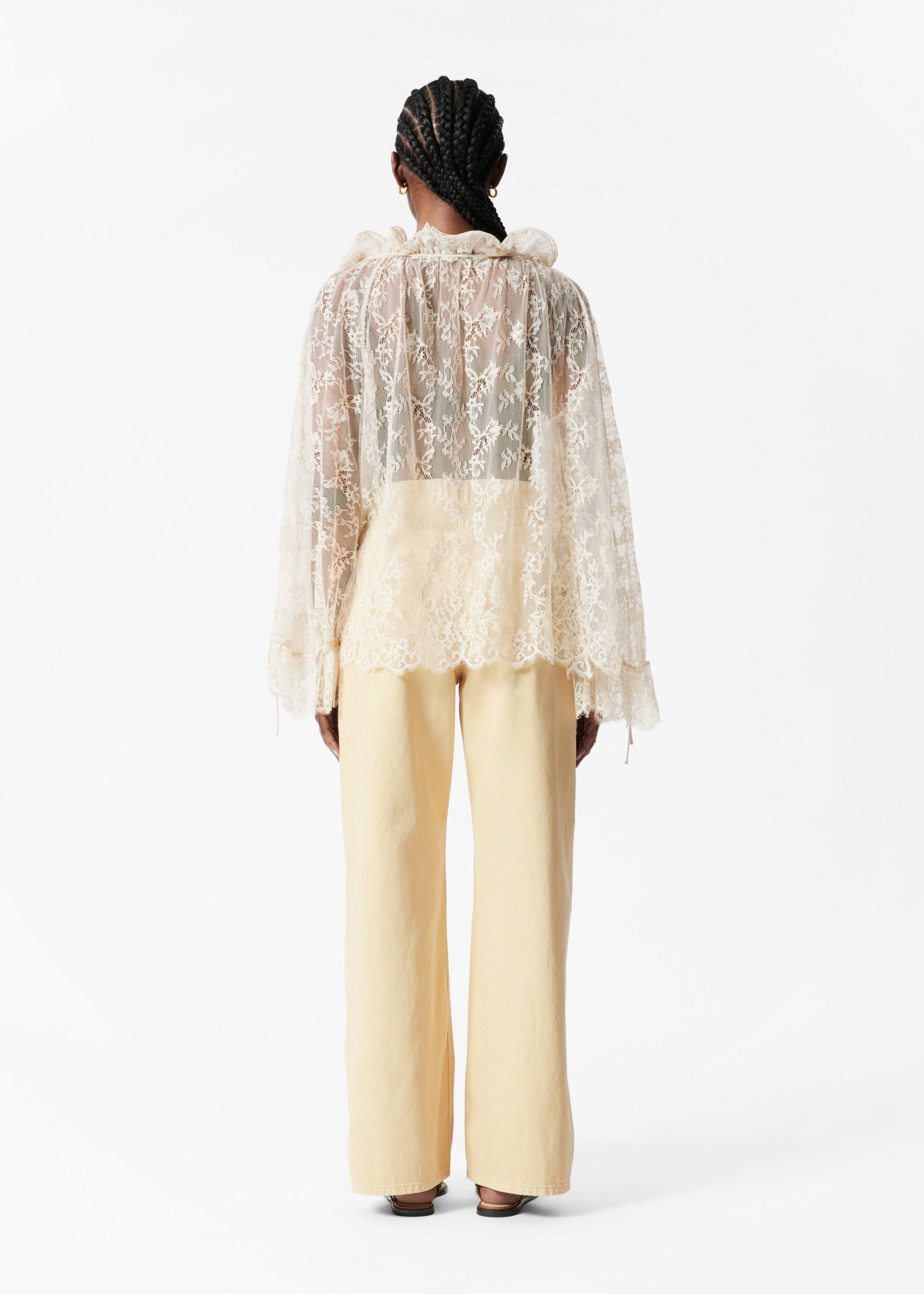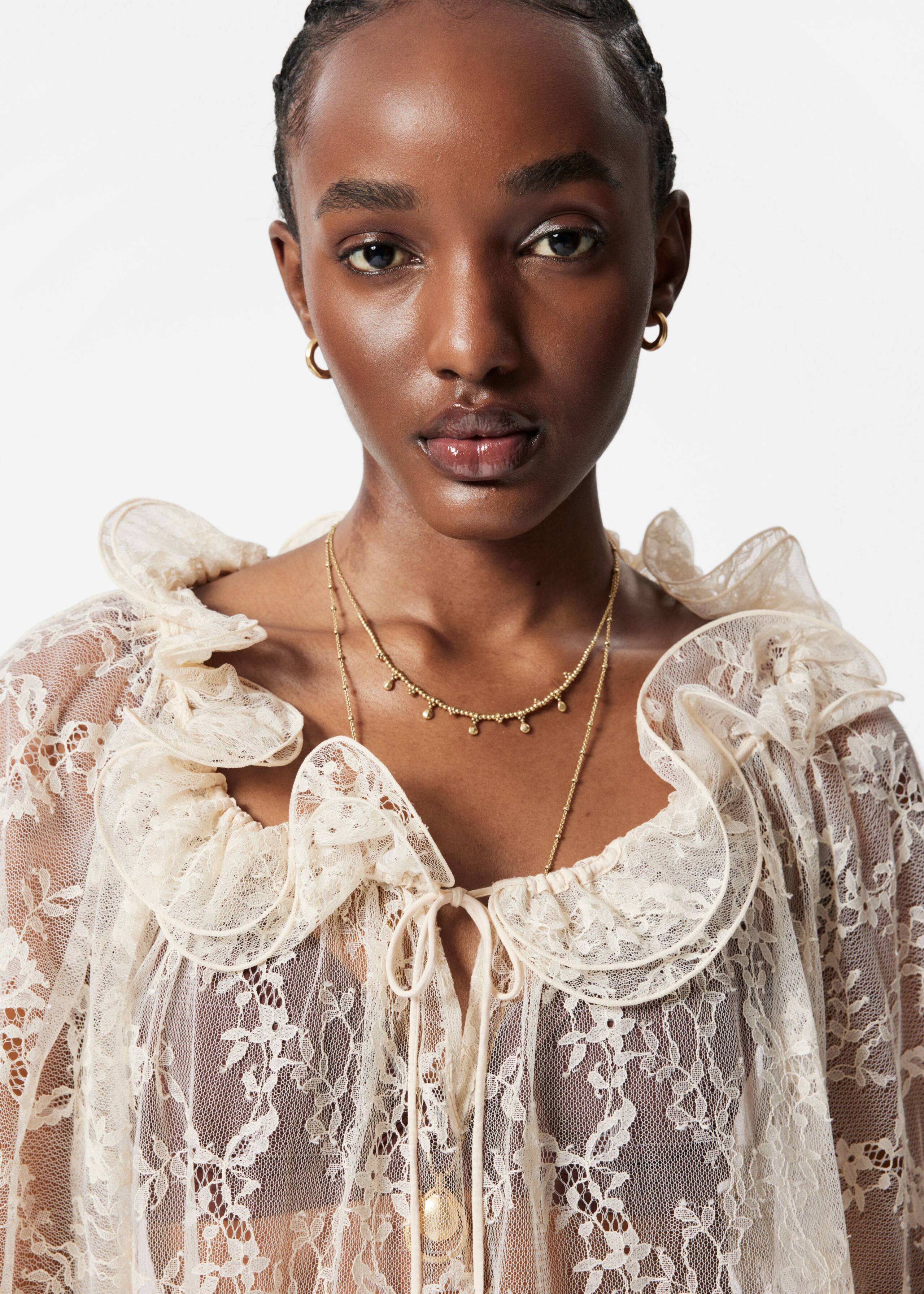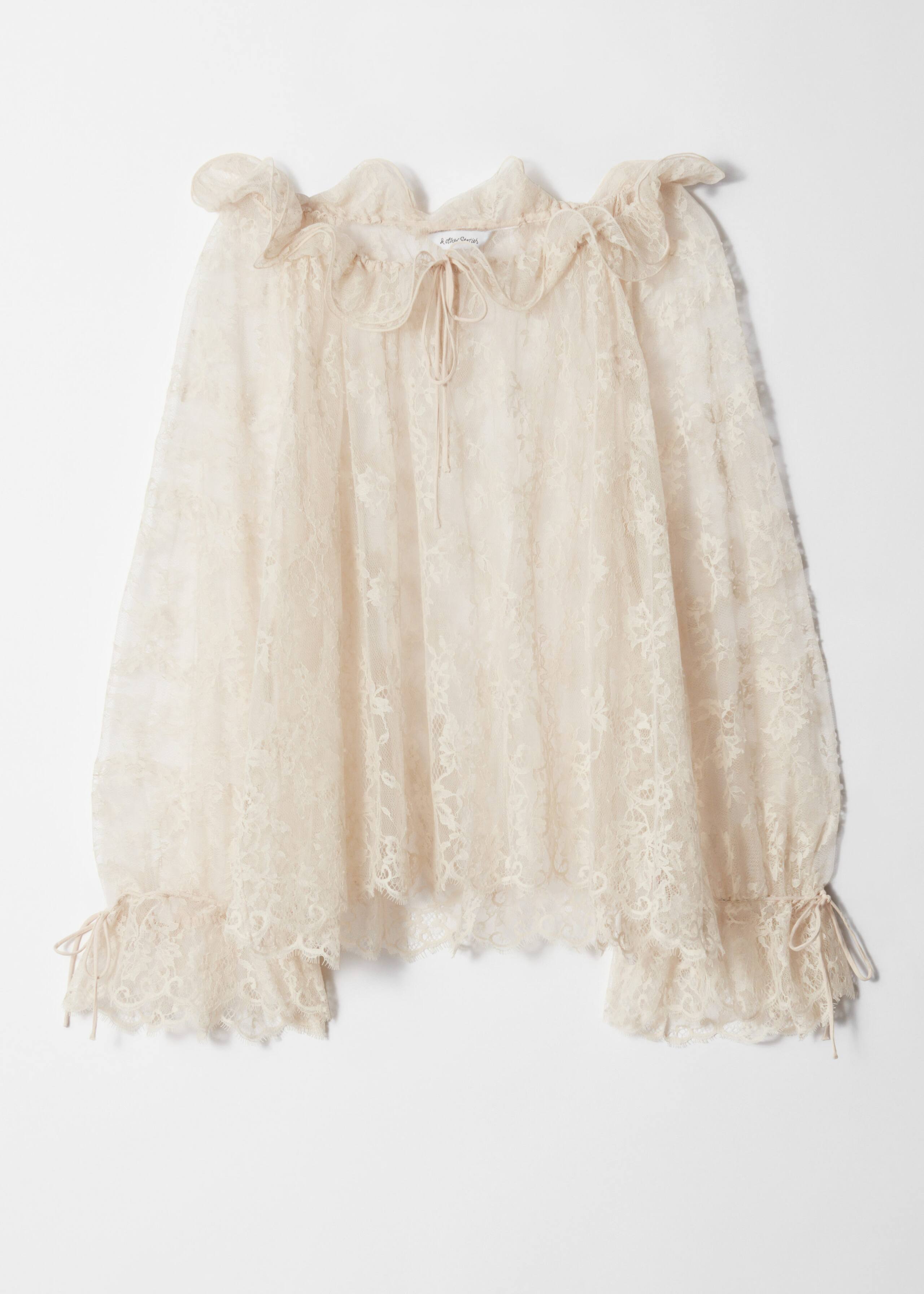Bluse mit Stehkragen und drapierten Raffungen an Hals, Schultern und Ärmeln.