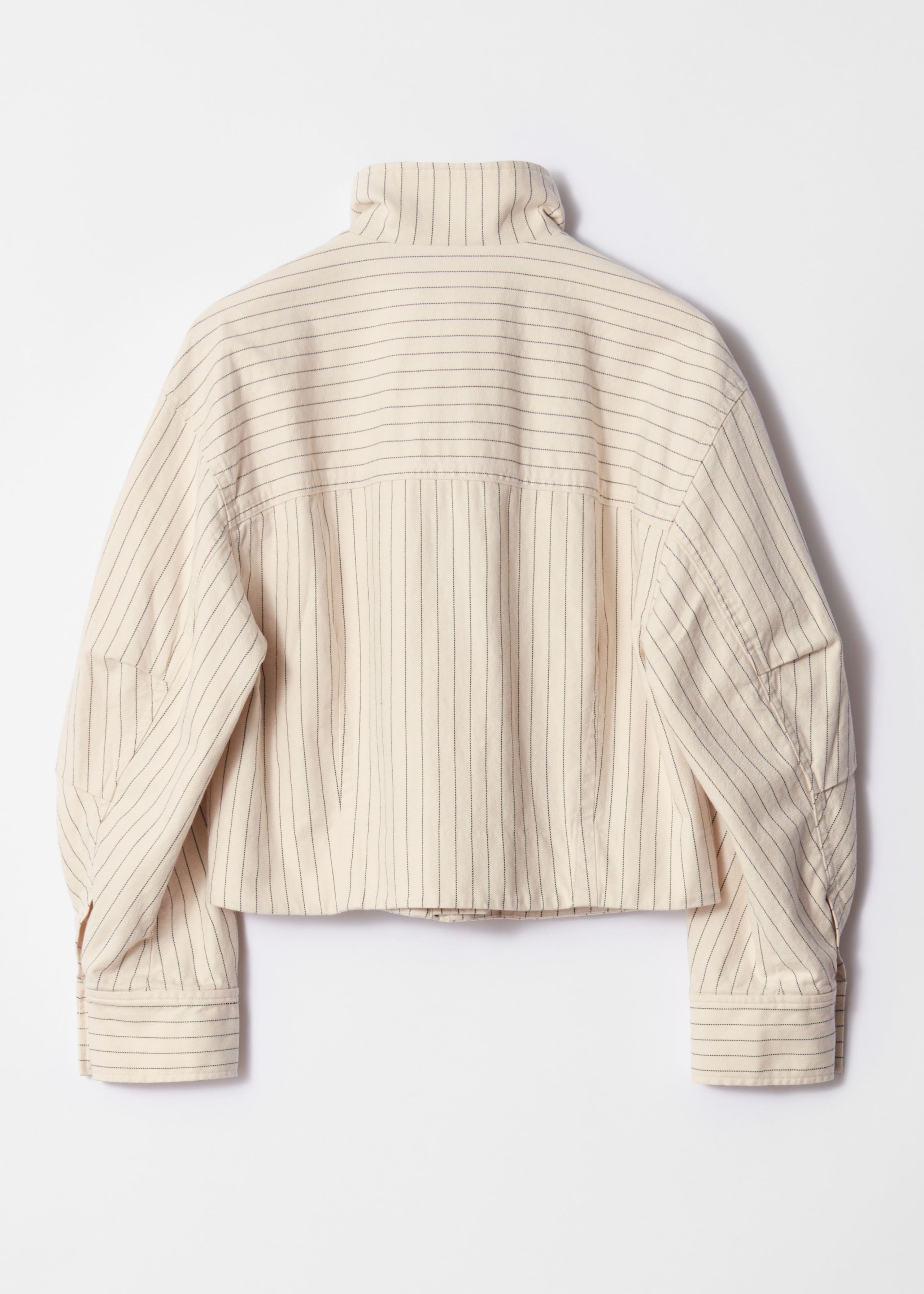 Jacke mit Stehkragen, überschnittenen Schultern und zwei aufgesetzten Taschen vorne. Das Modell verfügt über dekorative Steppnähte.