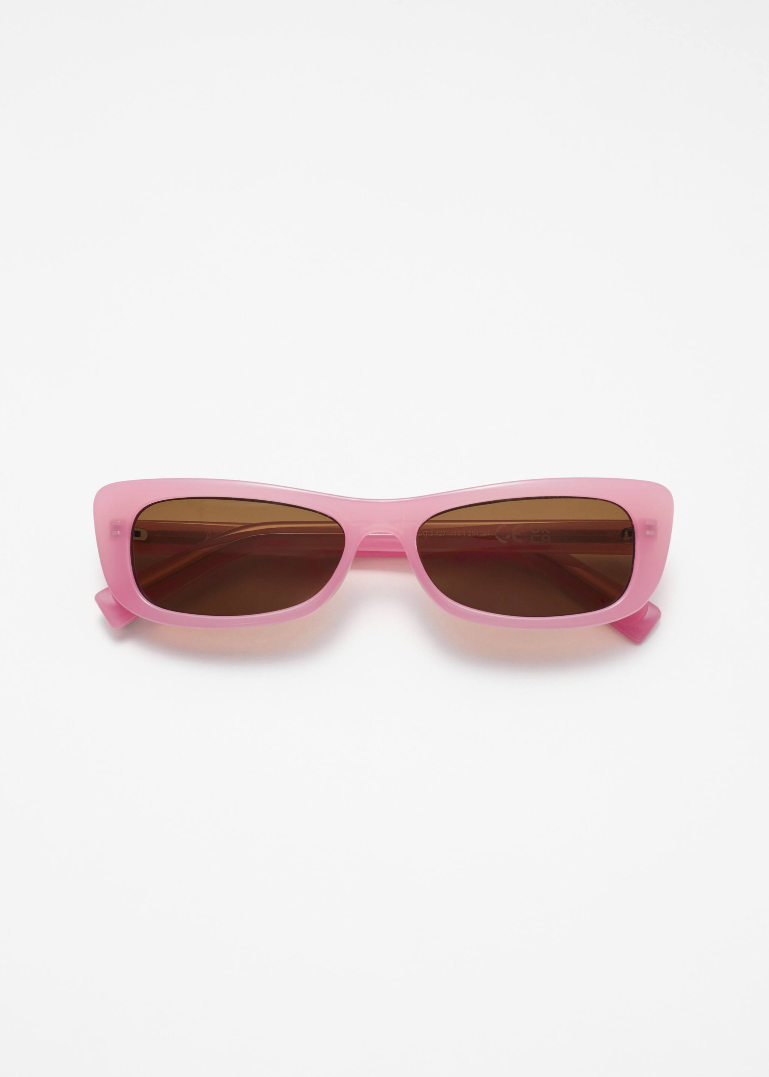 Diese Sonnenbrille im Retro-Look zeichnet sich durch einen Cat-Eye-Rahmen aus, der zu den Seiten hin breiter wird und nahtlos in auffällige, breite Bügel übergeht. Das Modell ist aus Acetat gefertigt und mit farblich passenden Gläsern ausgestattet, die stilvollen Schutz vor Sonnenstrahlen bieten.