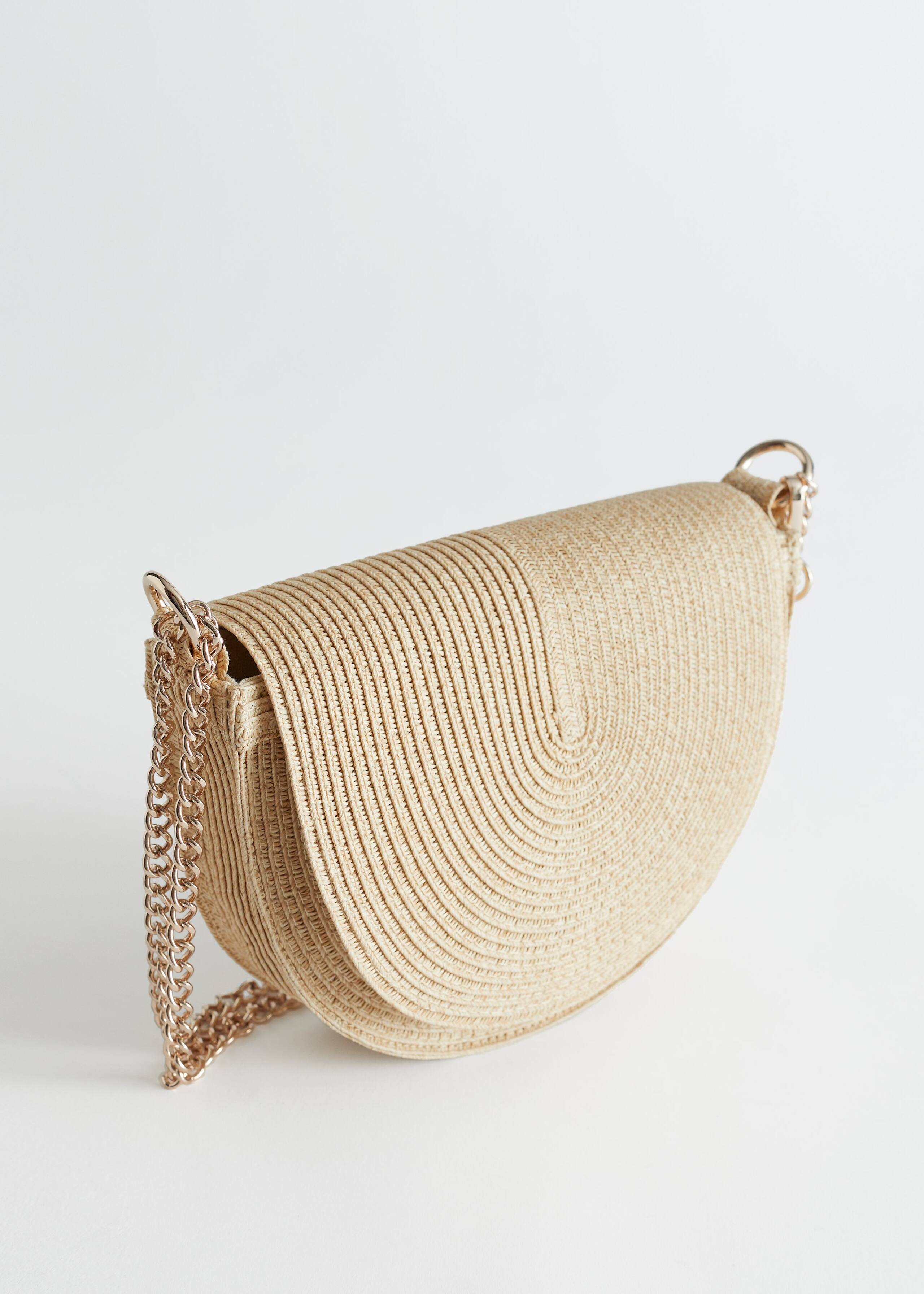Gewebte Strohtasche in Halbmondform mit Überschlag vorne und zwei goldfarbenen Kettentrageriemen.