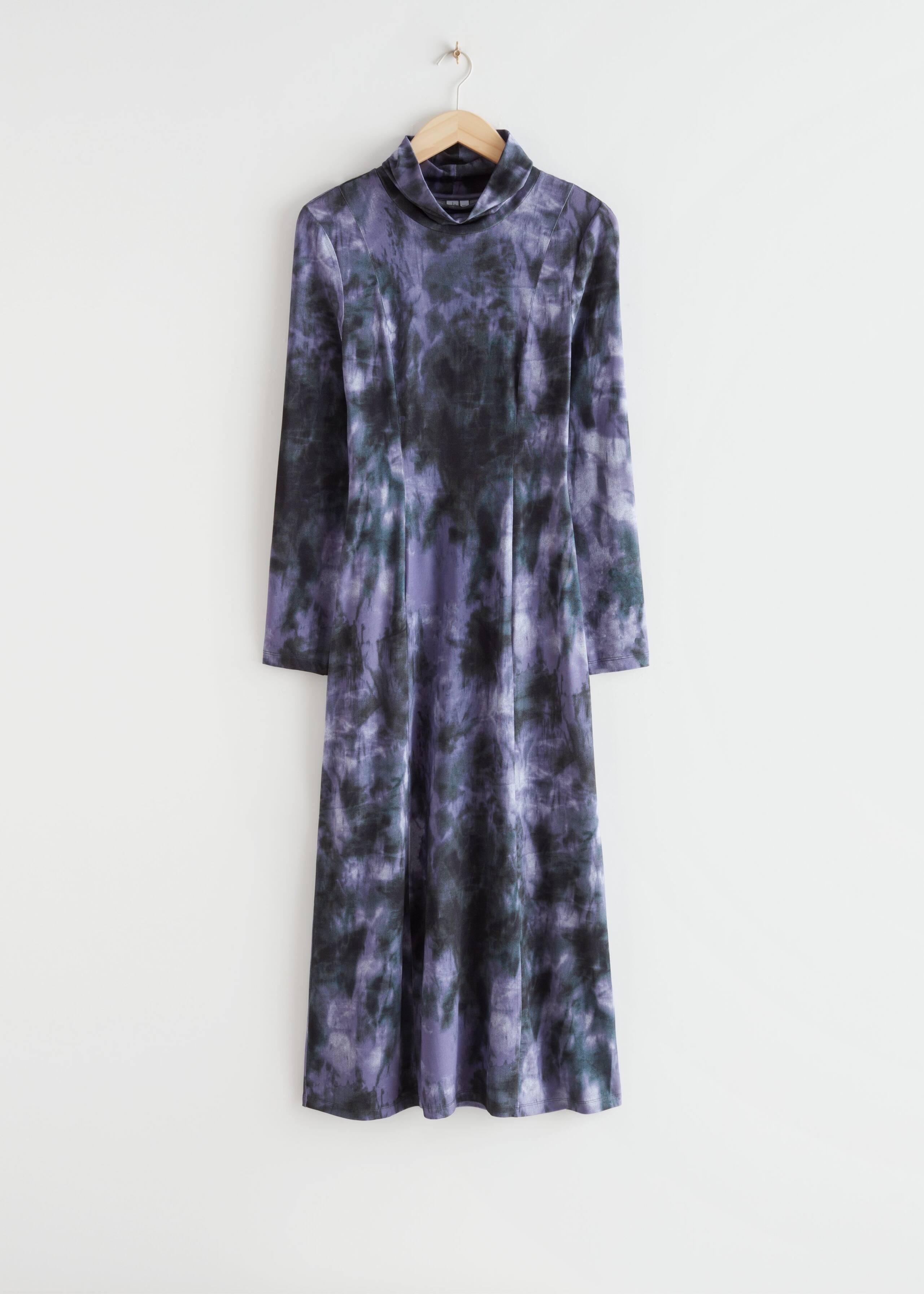 Langärmliges Midikleid mit Rollkragen und Batikmuster.