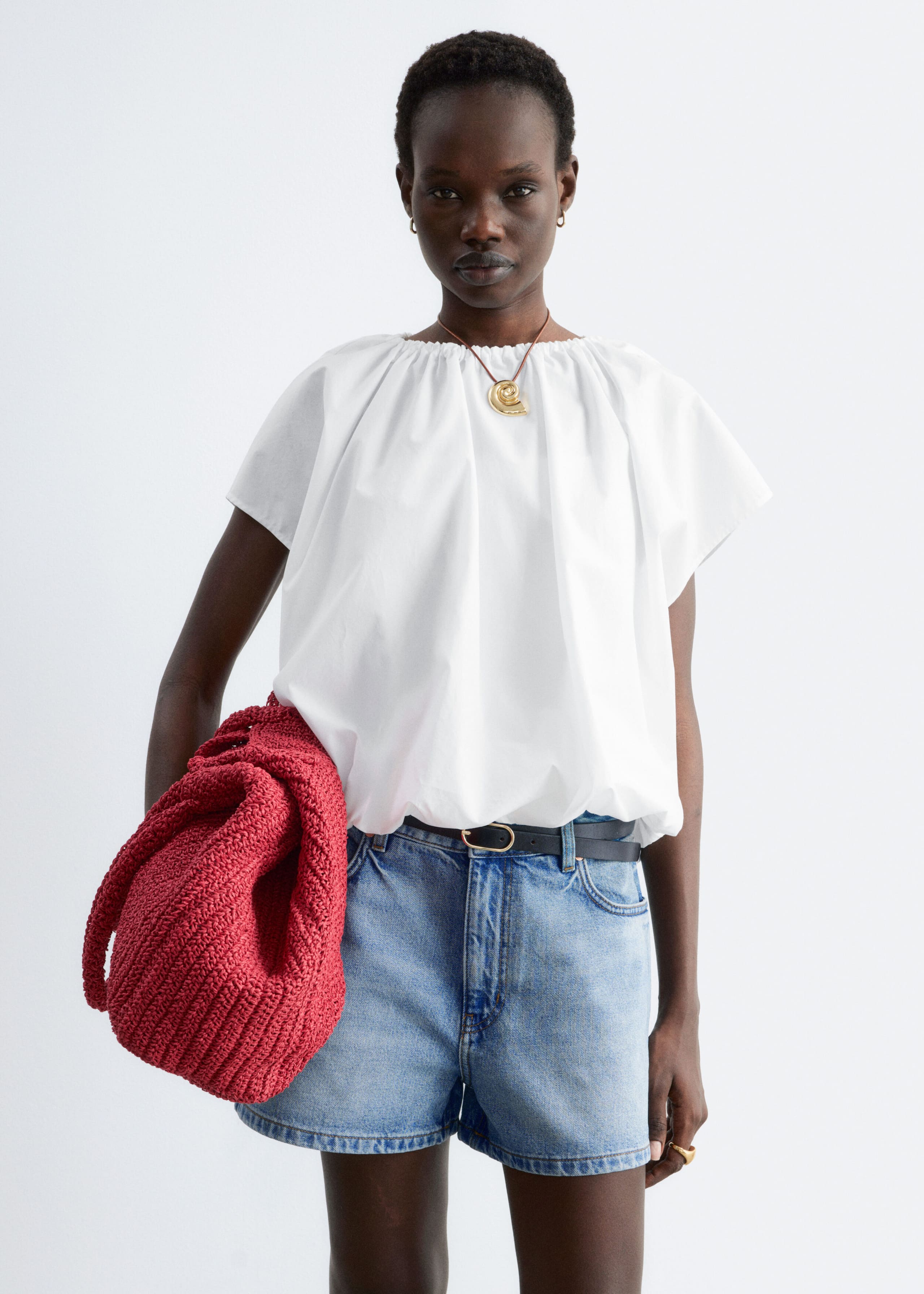 Crafted from pure mulberry silk, this sleeveless top features drawstring ties at the neckline and hem, creating an all-over ruched effect.