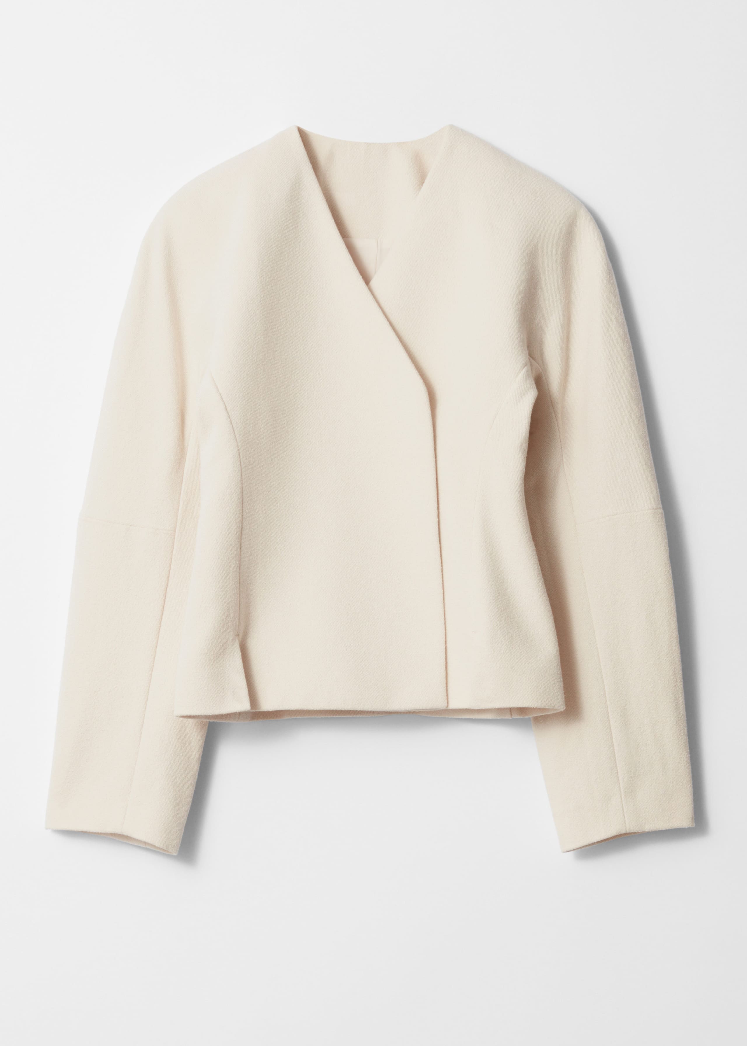 Funnel-sleeve wrap-front blazer with concealed clasp closures. It has lightly padded shoulders, front slits and is fully lined.