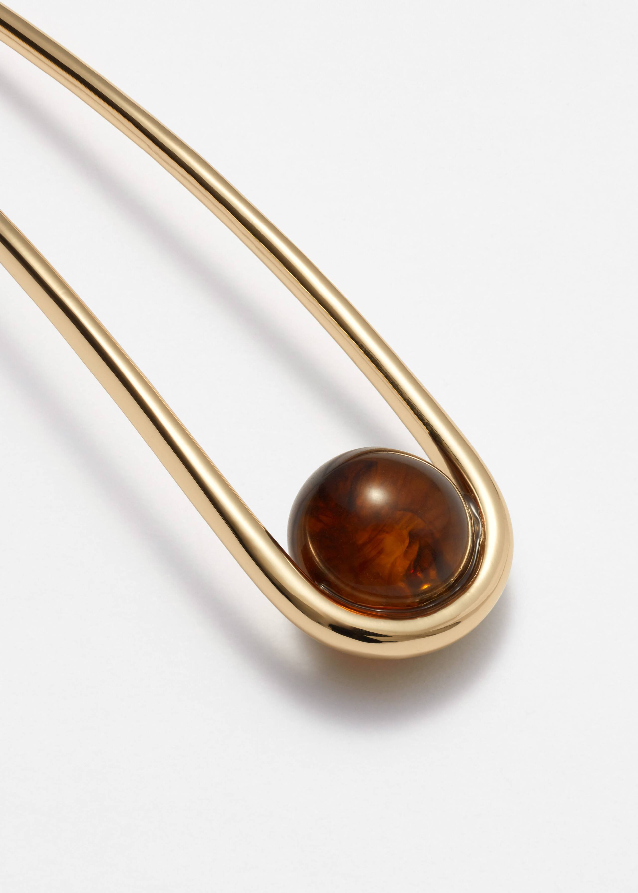 This hair pin has a curved shape that slips prettily into half-up hair or a sleek bun. It's made from gold-tone brass and detailed with a glass sphere.