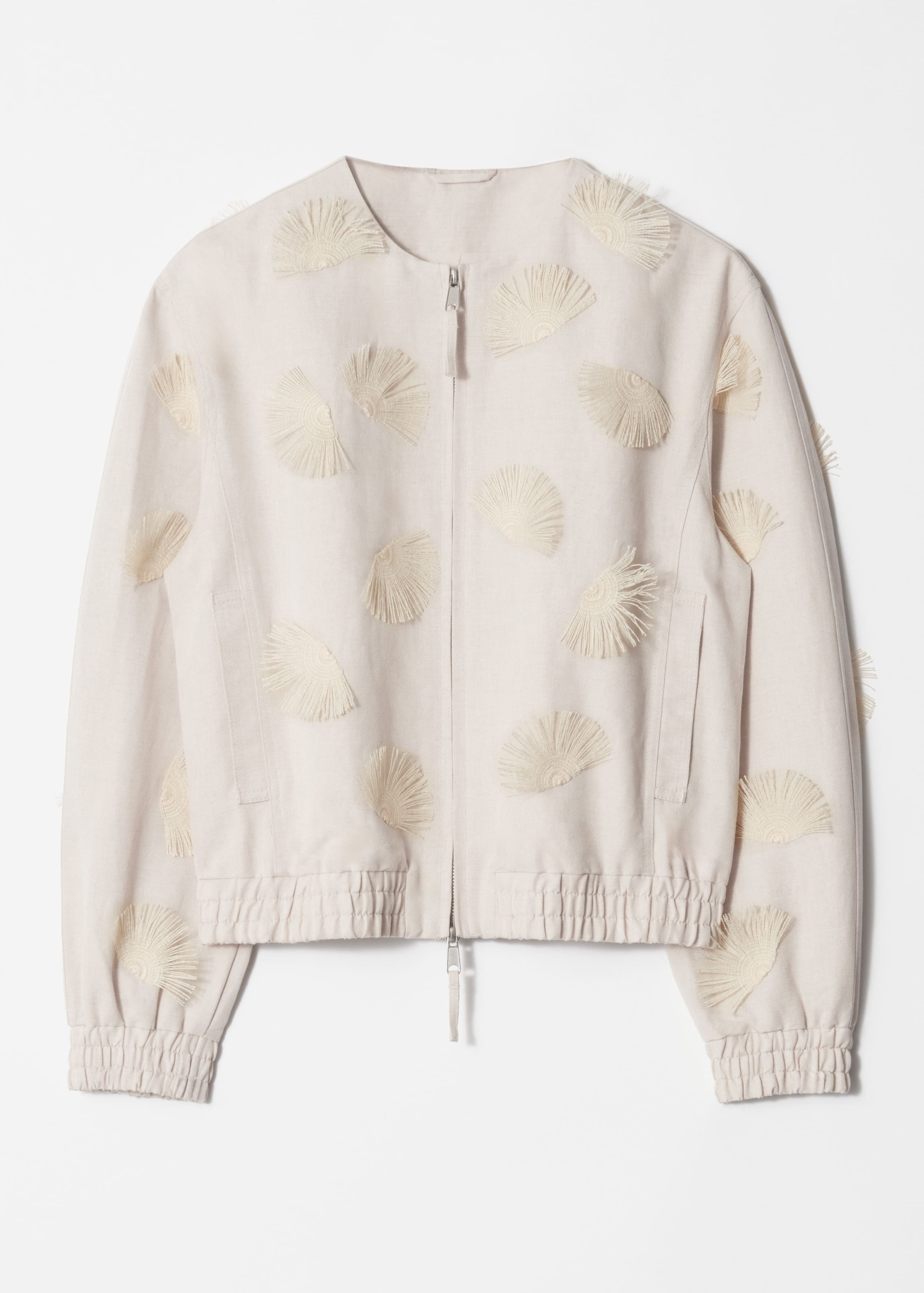 Bomber jacket crafted in a linen and cotton blend. Designed with decorative fan-shaped embroidery. Featuring a front zip closure, vertical welt pockets, and elastic, ruched details at the cuffs and hem.