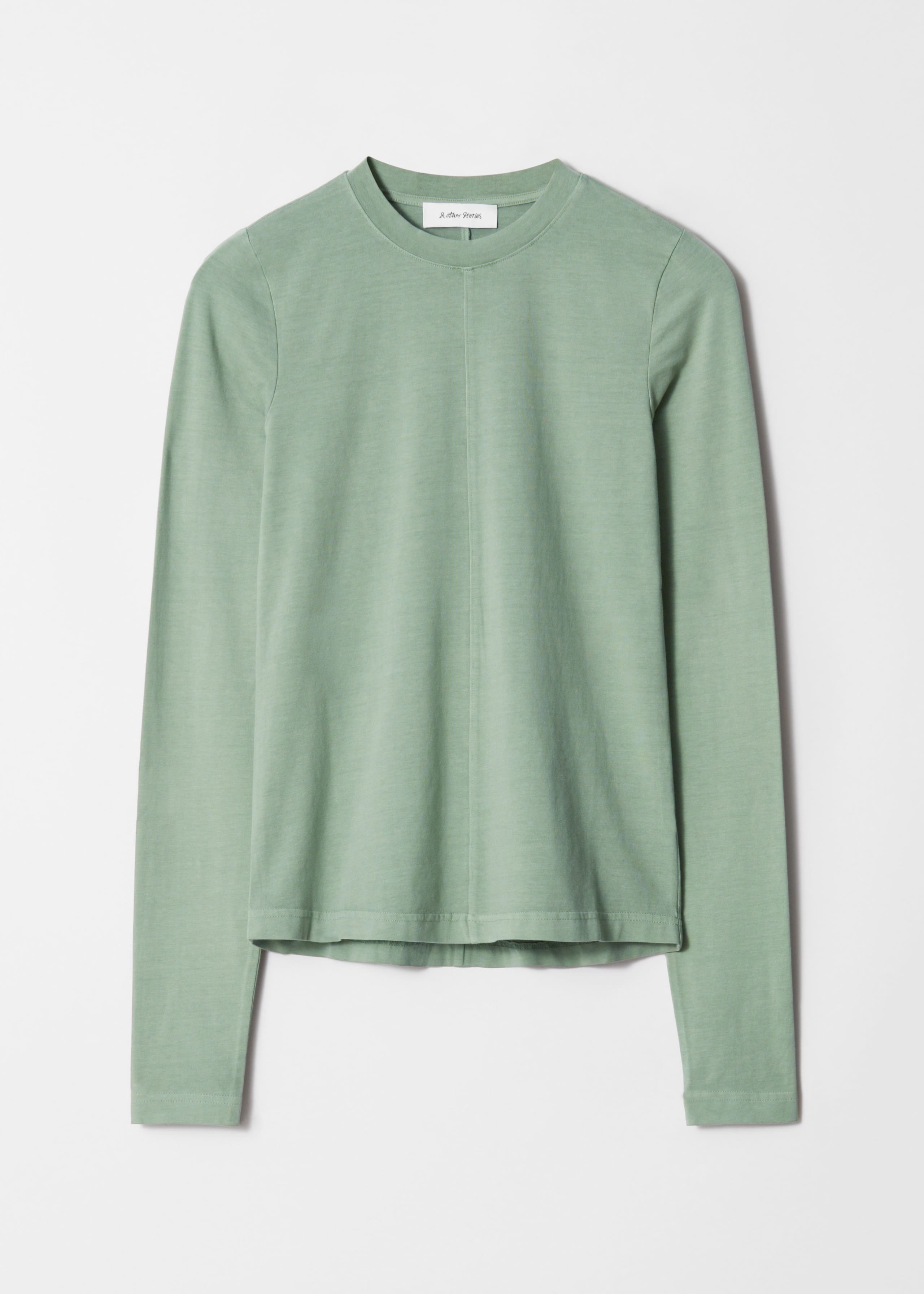 Slim fit long-sleeve top featuring a round neck, extra long sleeves, and a topstitched decorative seam across the front and back.