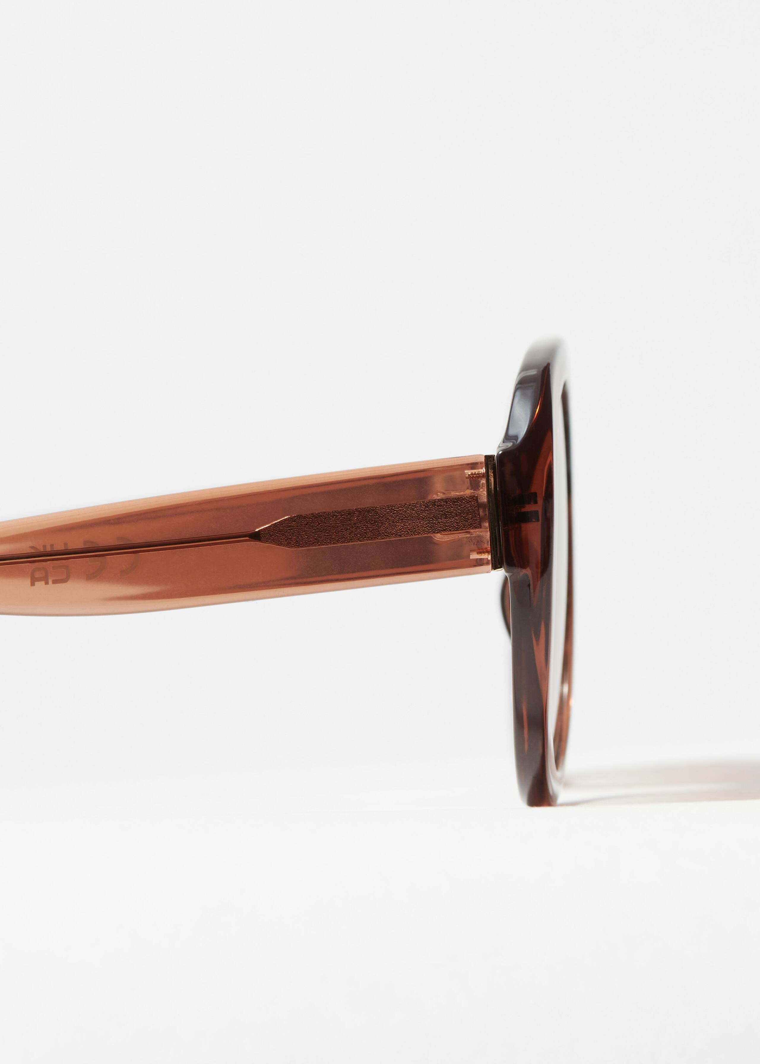 This pair is crafted from tortoiseshell acetate with oversized, aviator-style frames and gold-tone details on the arms.