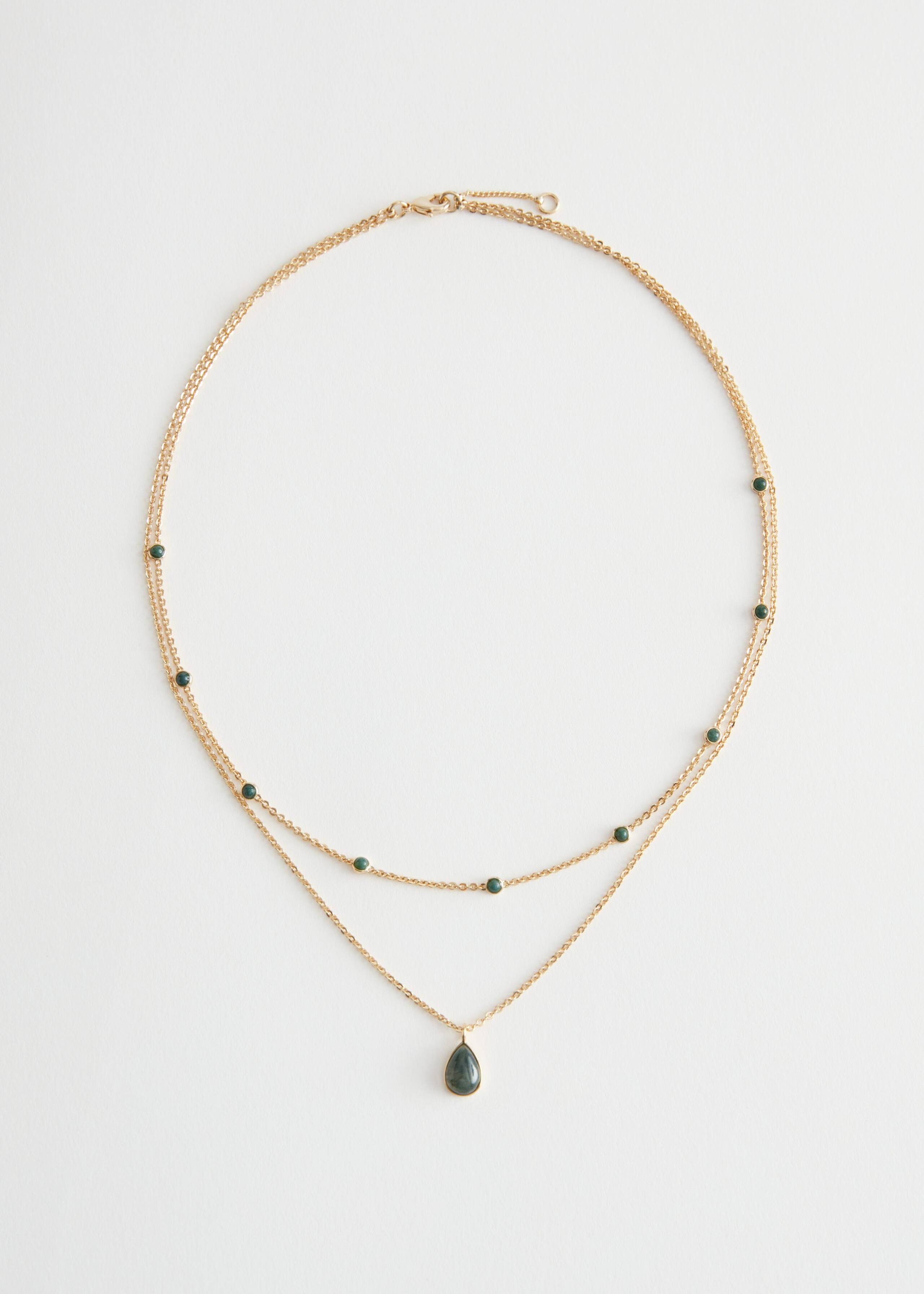 Delicate metallic duo layered necklace embellished with small gemstones and. a large gemstone pendant.