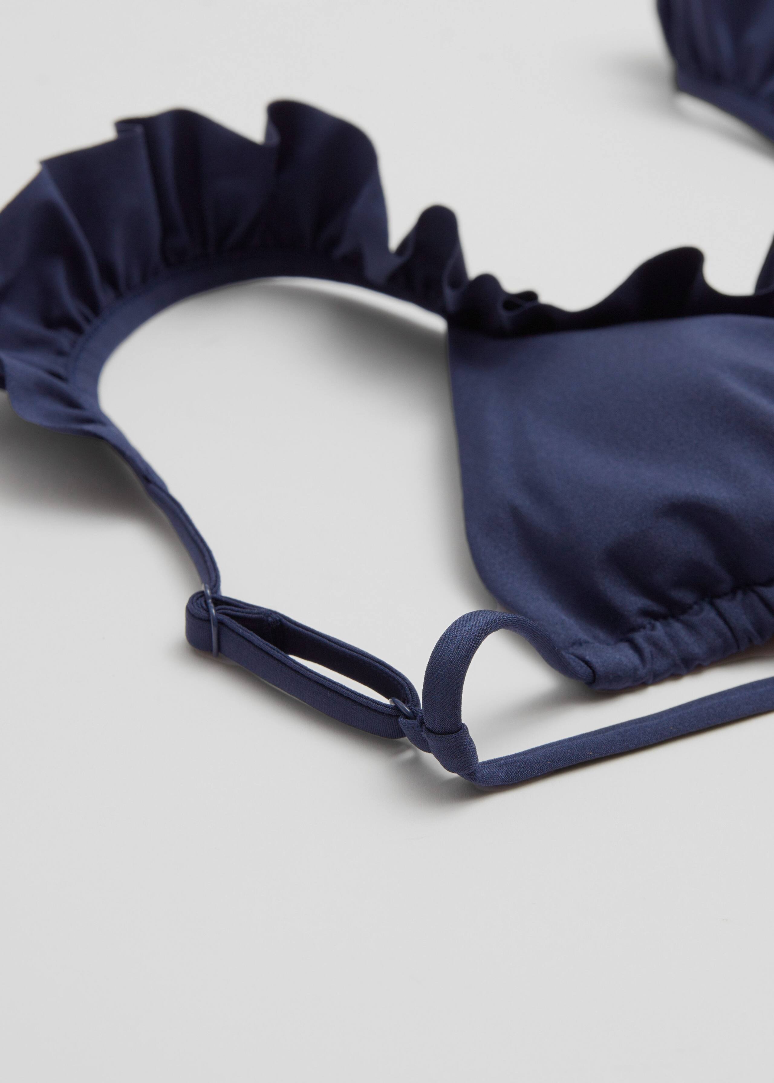 Frilled triangle bikini top featuring adjustable straps and light, removable padding.
