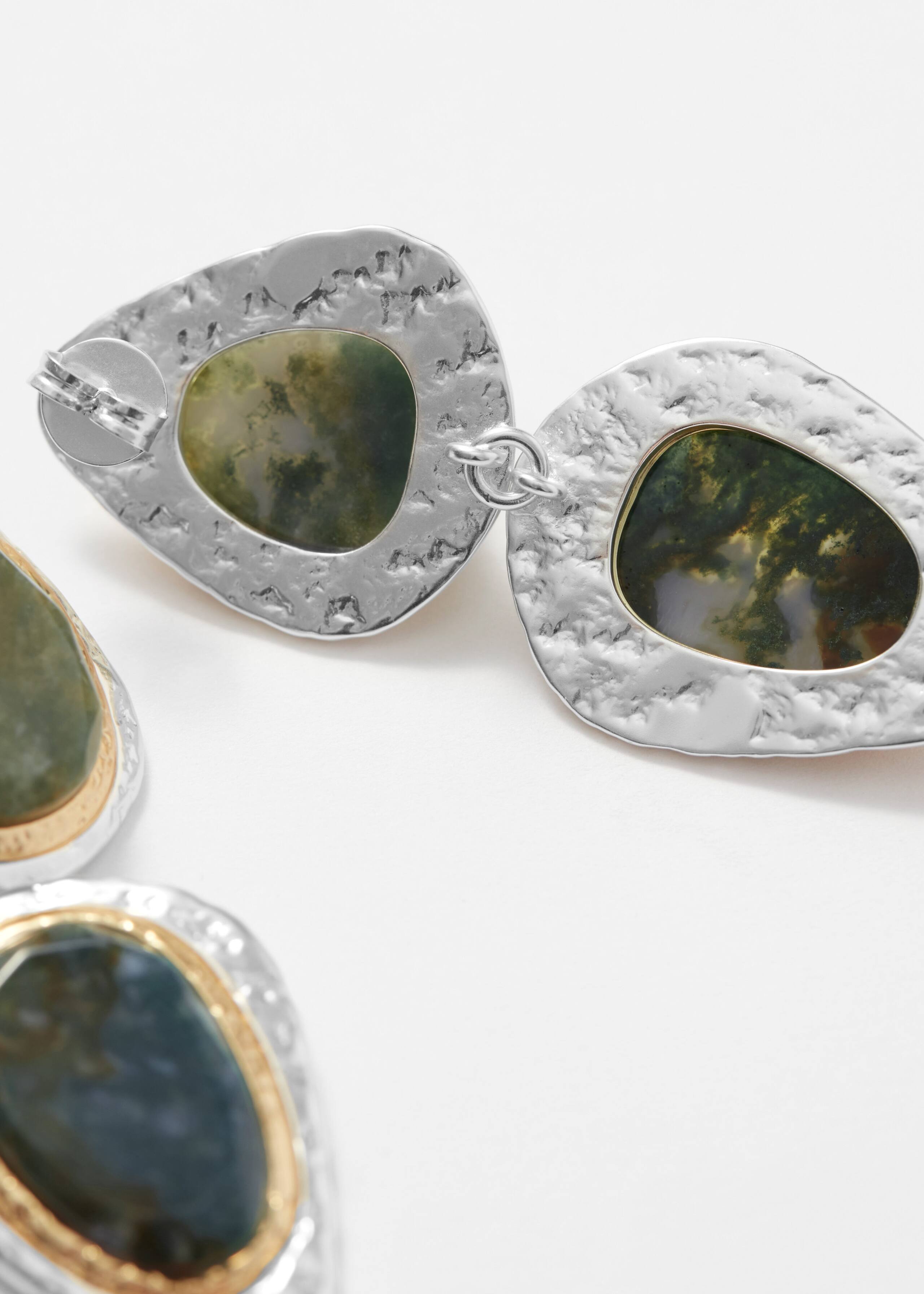 This delicate gold-tone necklace features two elegantly layered anchor chains: a shorter, beaded strand and a longer strand adorned with sphere and cluster beads at the front, some of which are accented with angular drop beads. A chunky, two-part pendant enhances the longer chain, serving as a striking statement feature. Adjustable length with a secure trigger clasp at the back for a perfect fit.