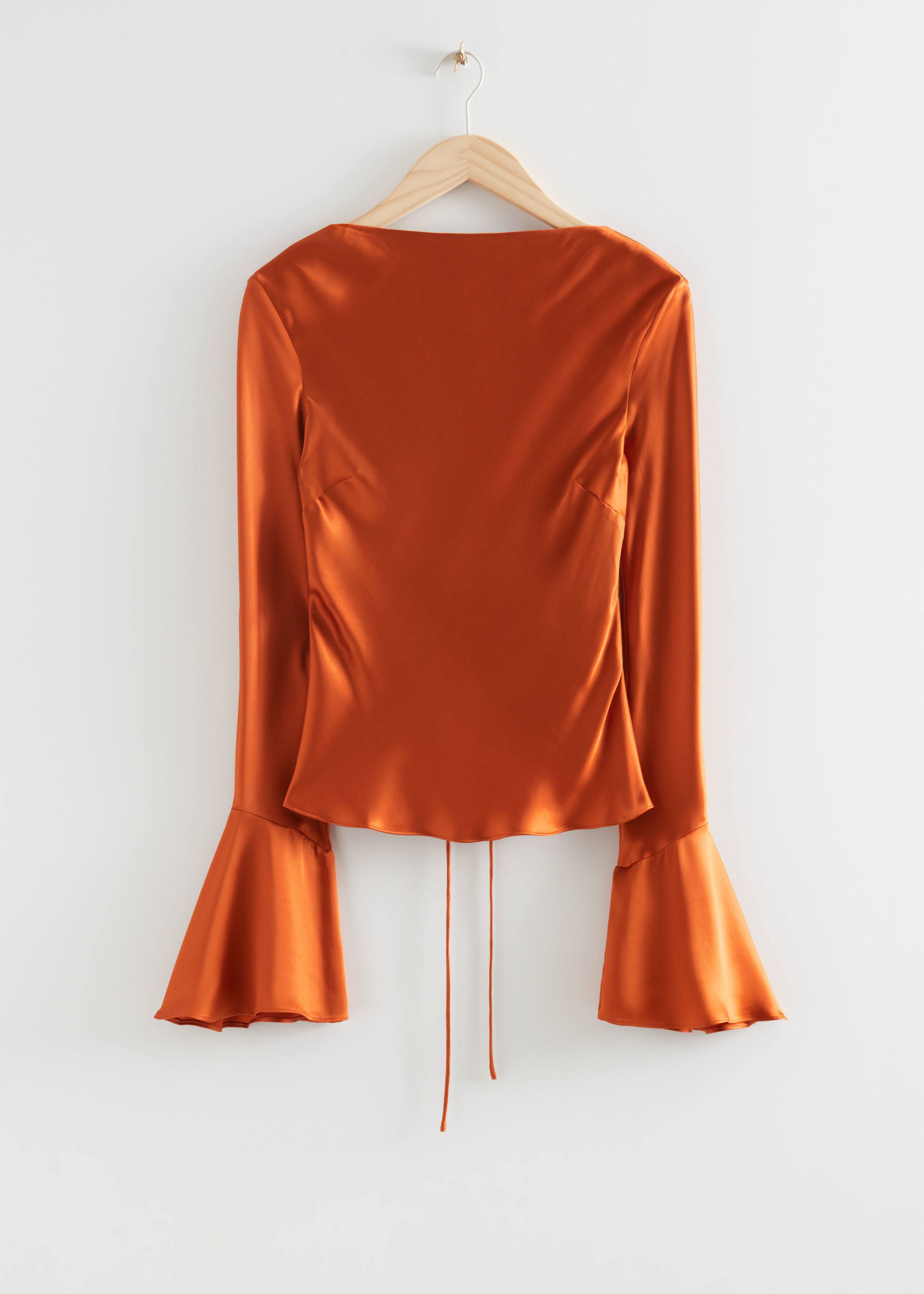 Open back flared sleeve satin top featuring spagetti lace up straps.