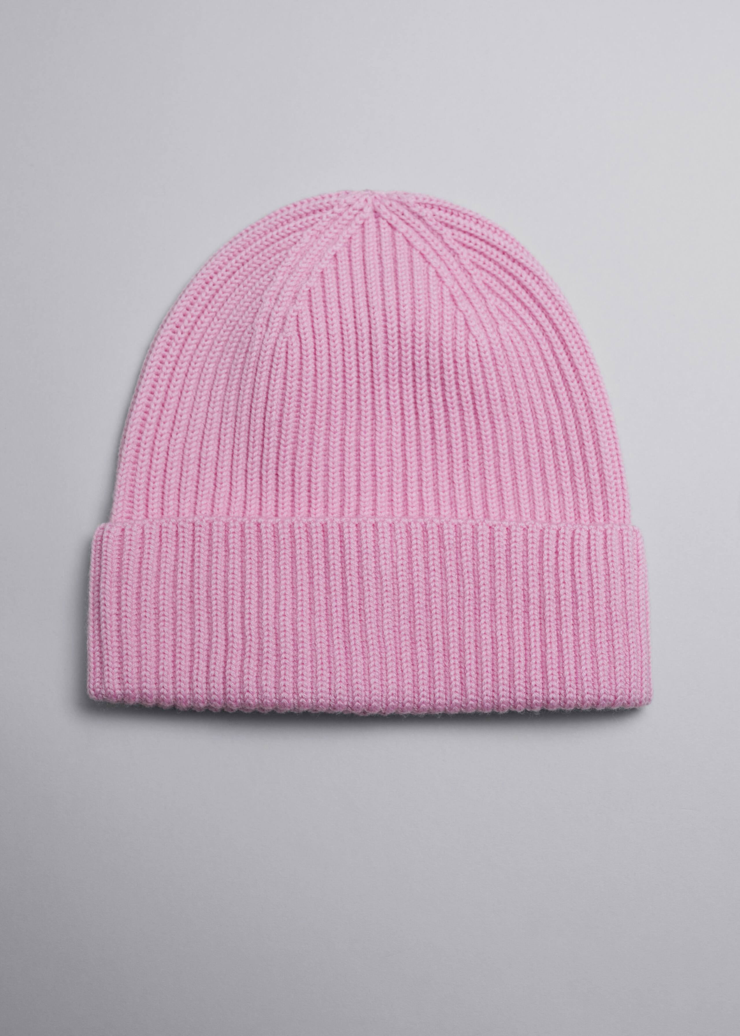 Beanie knitted in a full cardigan stitch with an exaggerated two-tone relief, crafted from soft wool. Styled with an 8.5 cm fold-up.