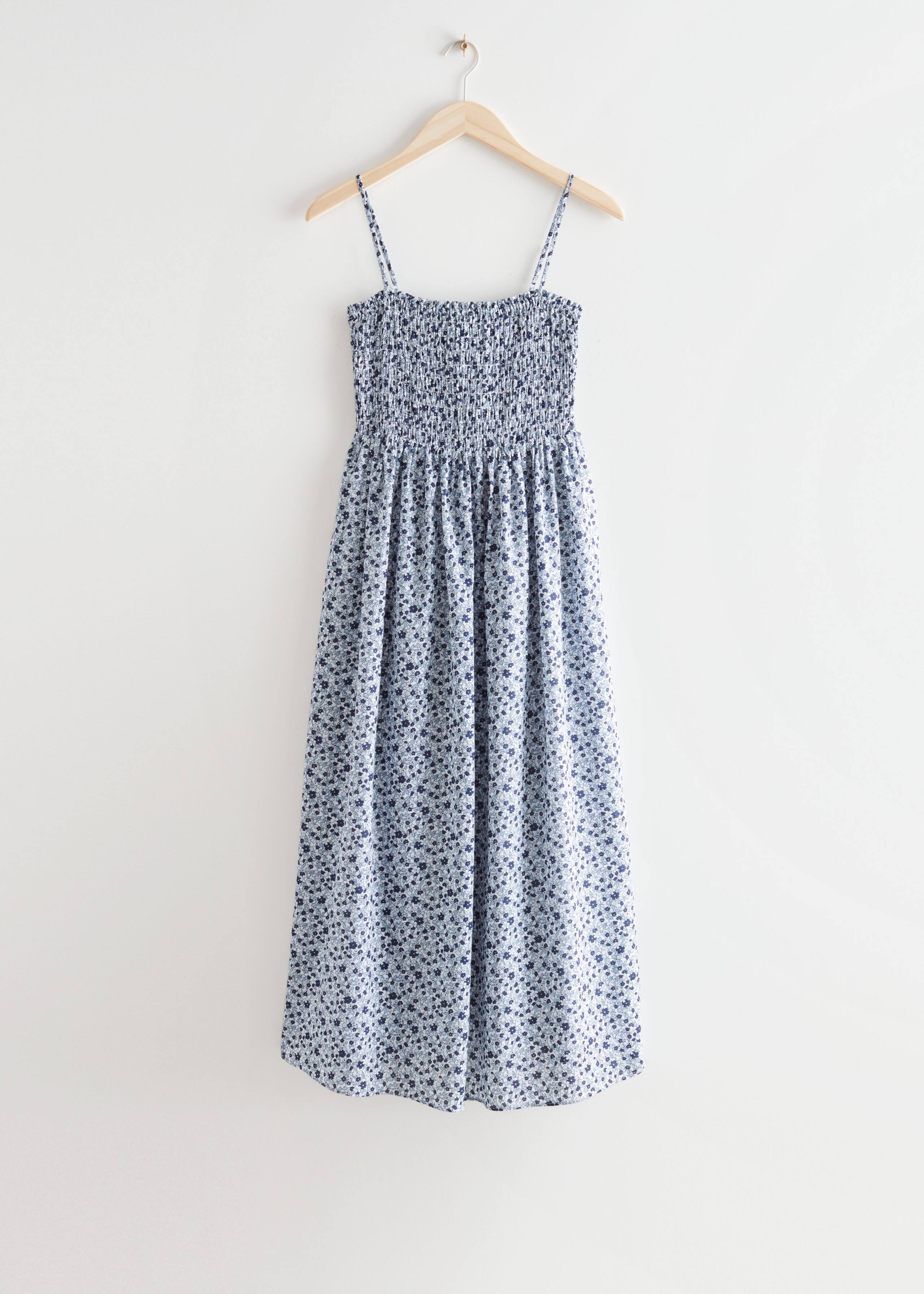 Sleeveless midi dress featuring thin shoulder straps and a smocked bodice.
