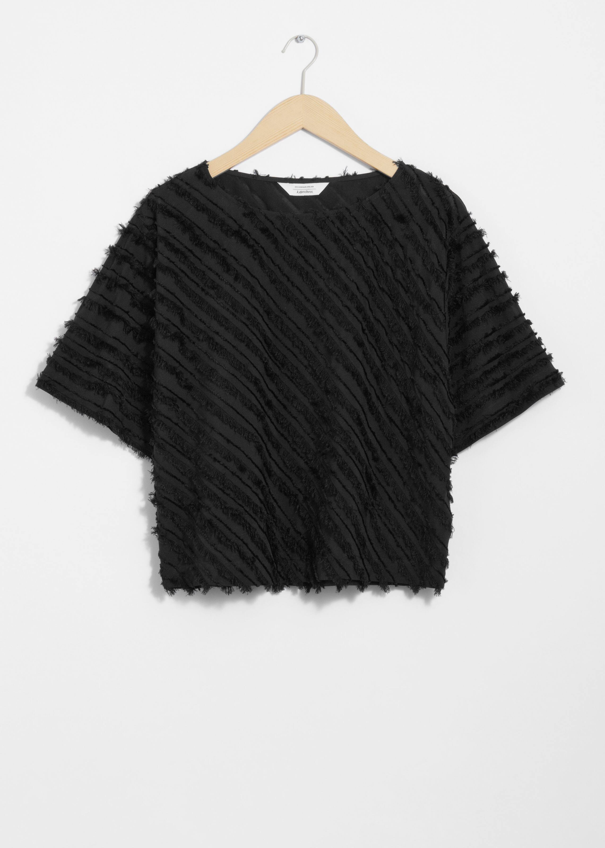 Short-sleeve with a textured, fringed finish.
