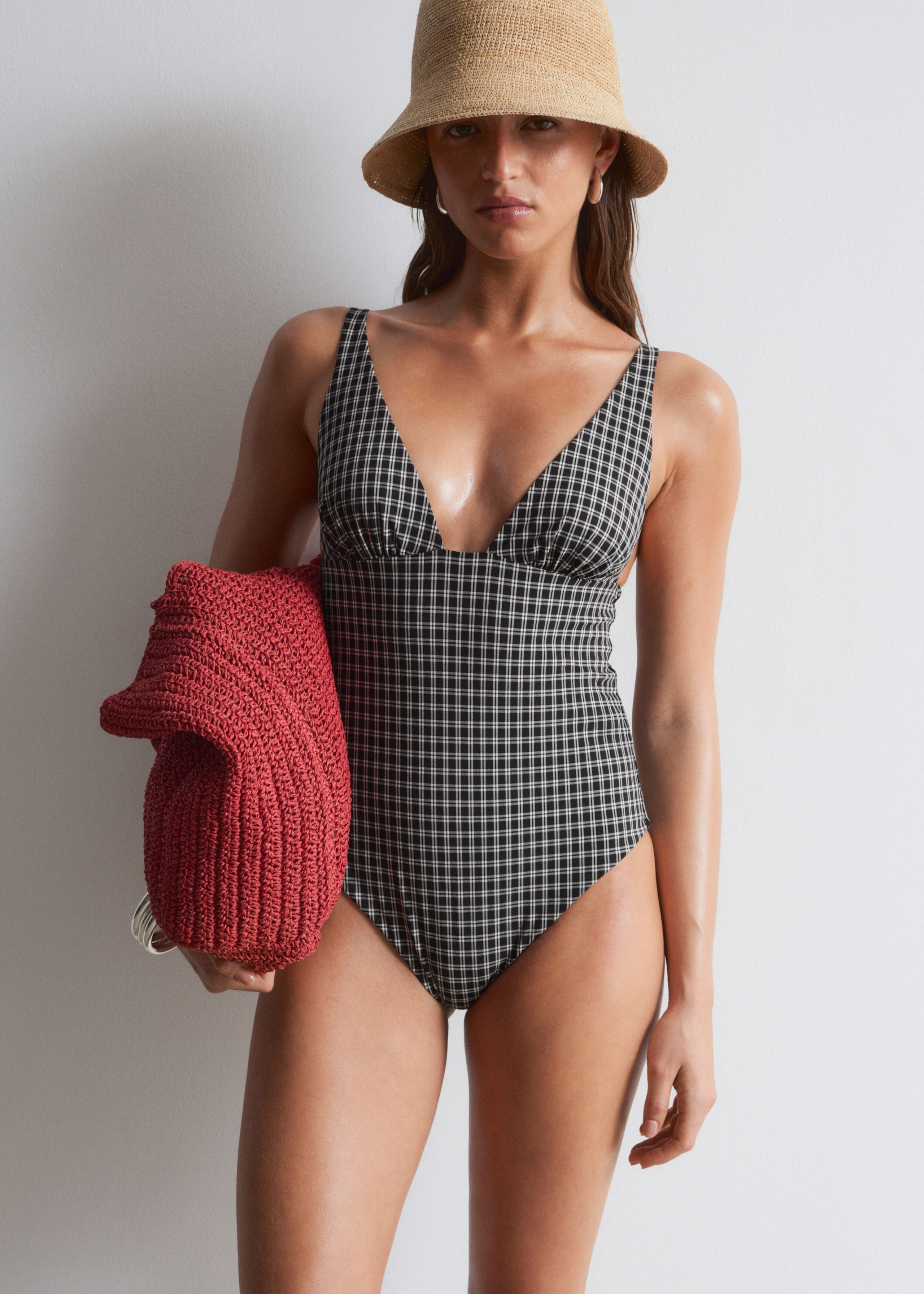 A classic triangle bikini is always in style. This iteration is shaped by gathers at the underbust, with removable padding, adjustable shoulder straps and a tie fastening at the back for a personalised fit.