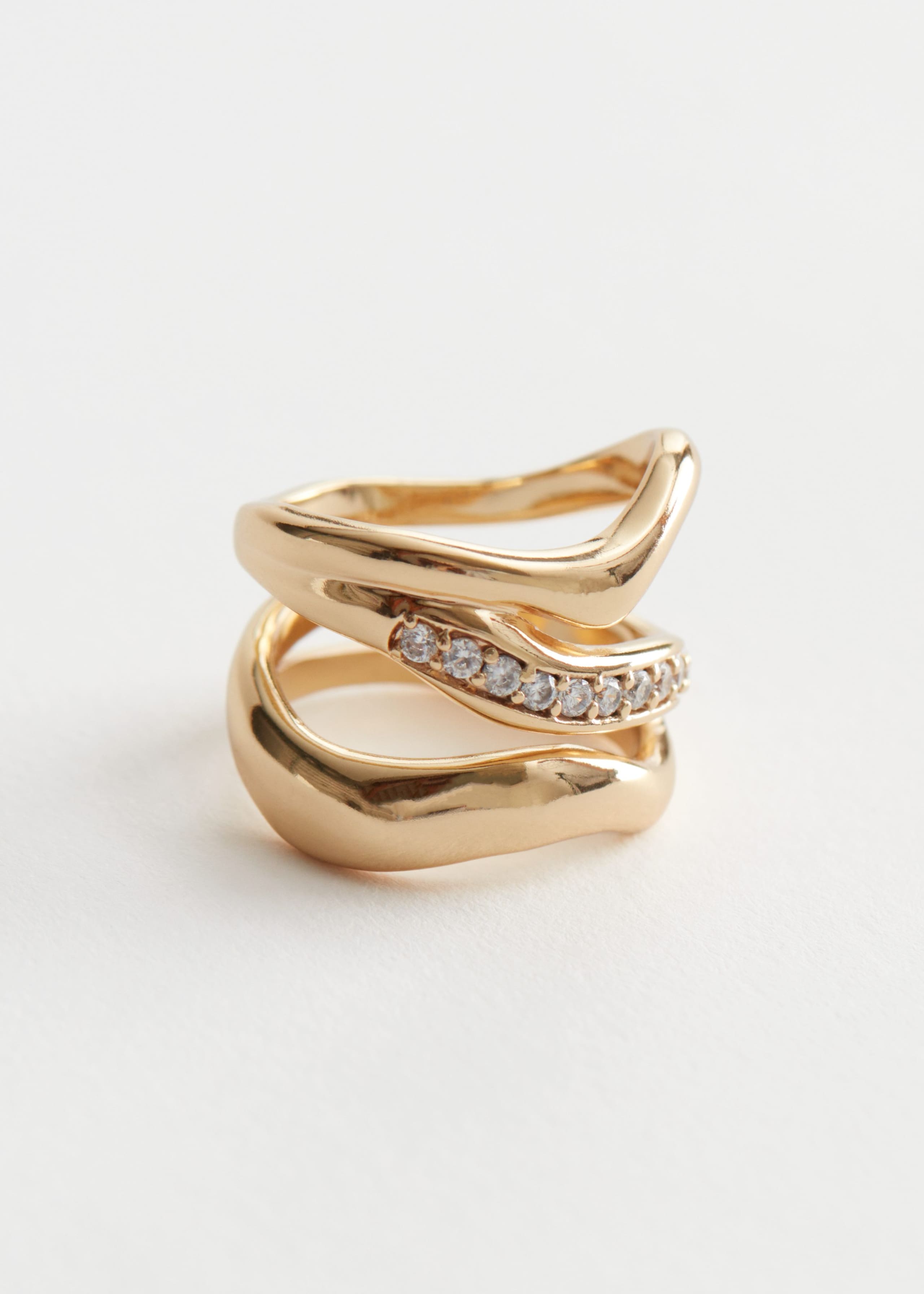 Gold-toned triple band embossed ring in a fluid texture encrusted with rhinestones.