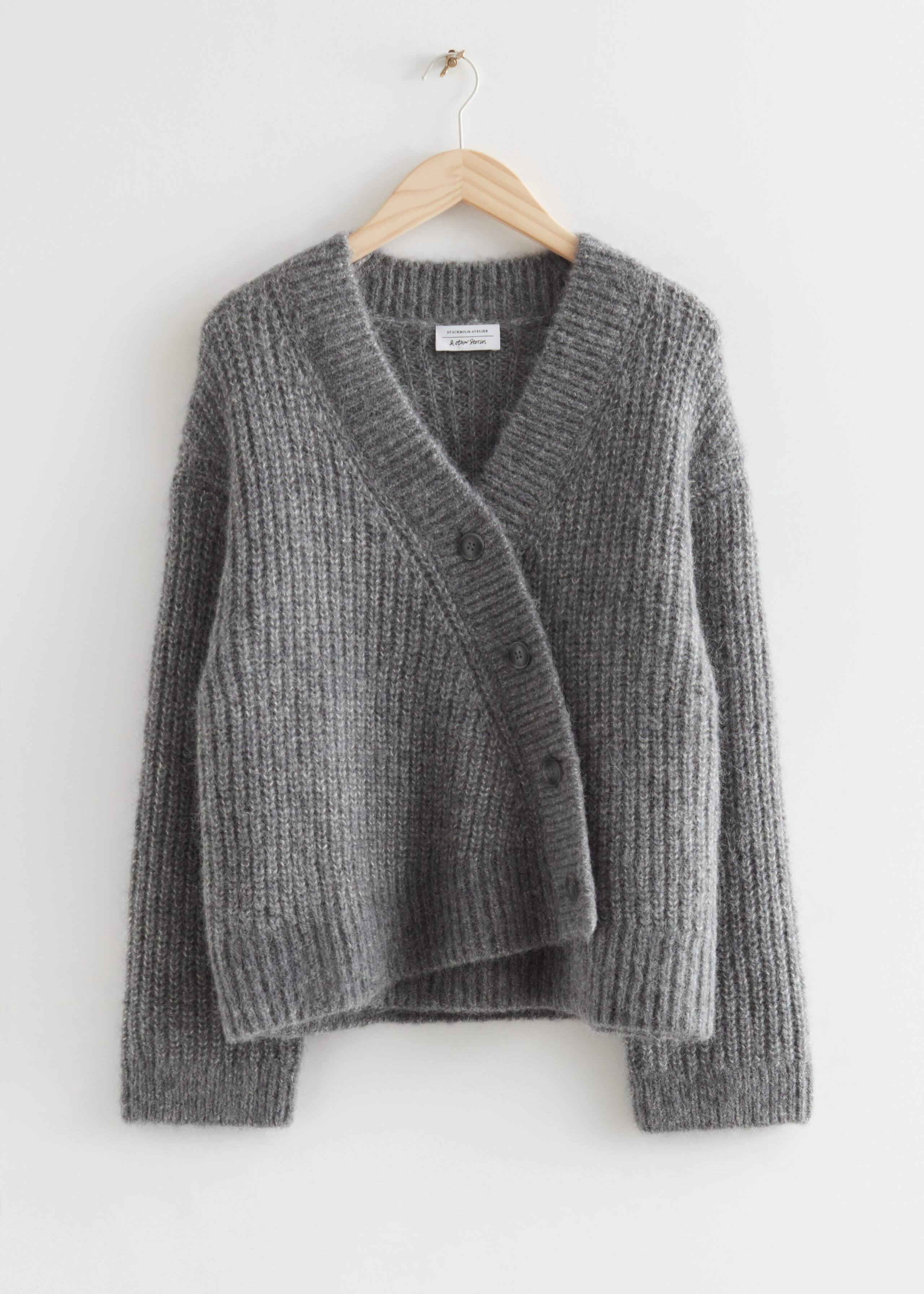 Wool knit cardigan, featuring an overlapping buttoned front with v-neck and ribbed trims in a relaxed silhouette.
