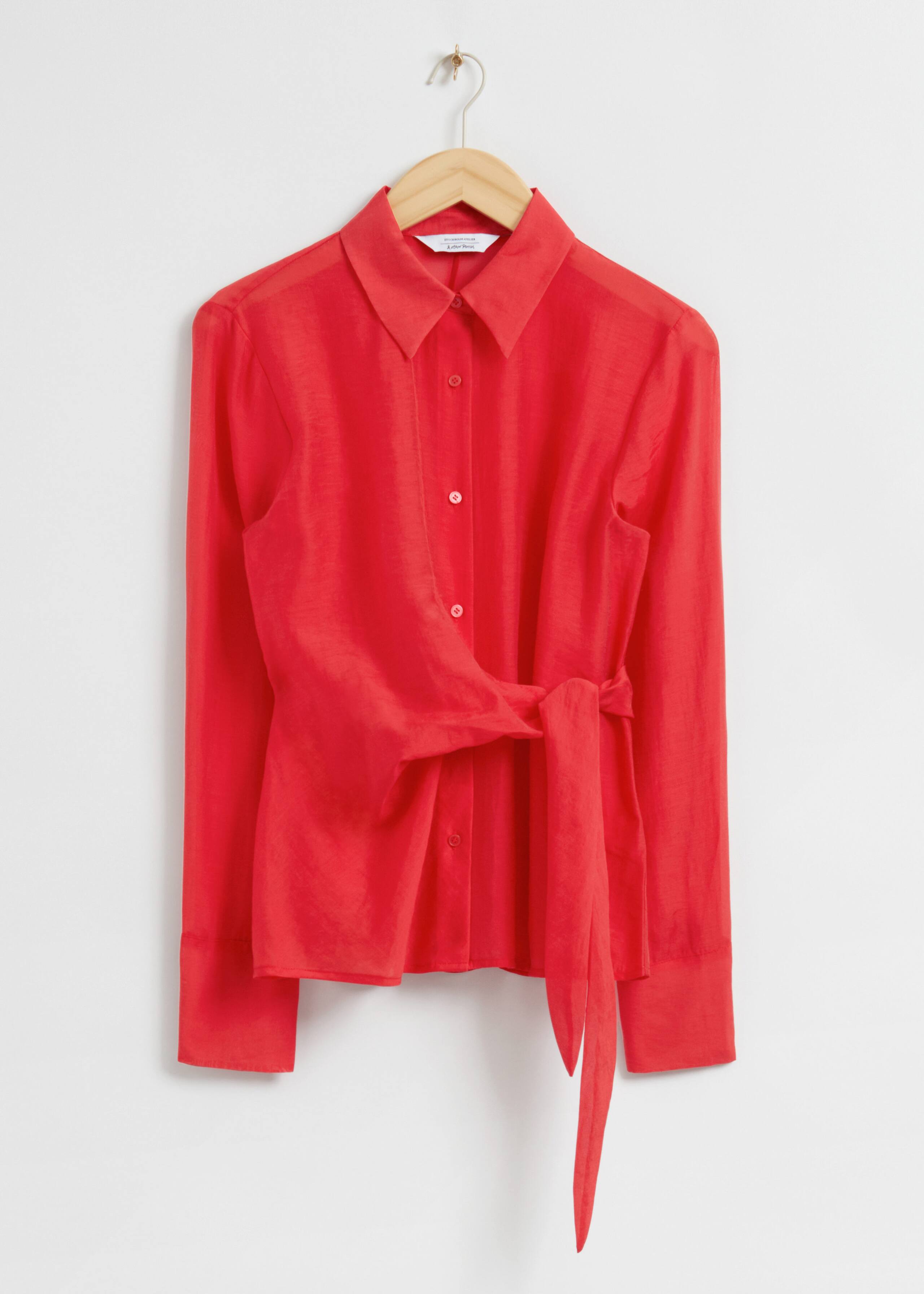 Slim-fit wrap tie shirt crafted from soft, airy material defined by a gathered double layer waist tie secured at the side in a double knot. Featuring slightly ruched sleeves with straight plain cuffs and a classic collar. Finished with a buttoned front and centre back seam.
