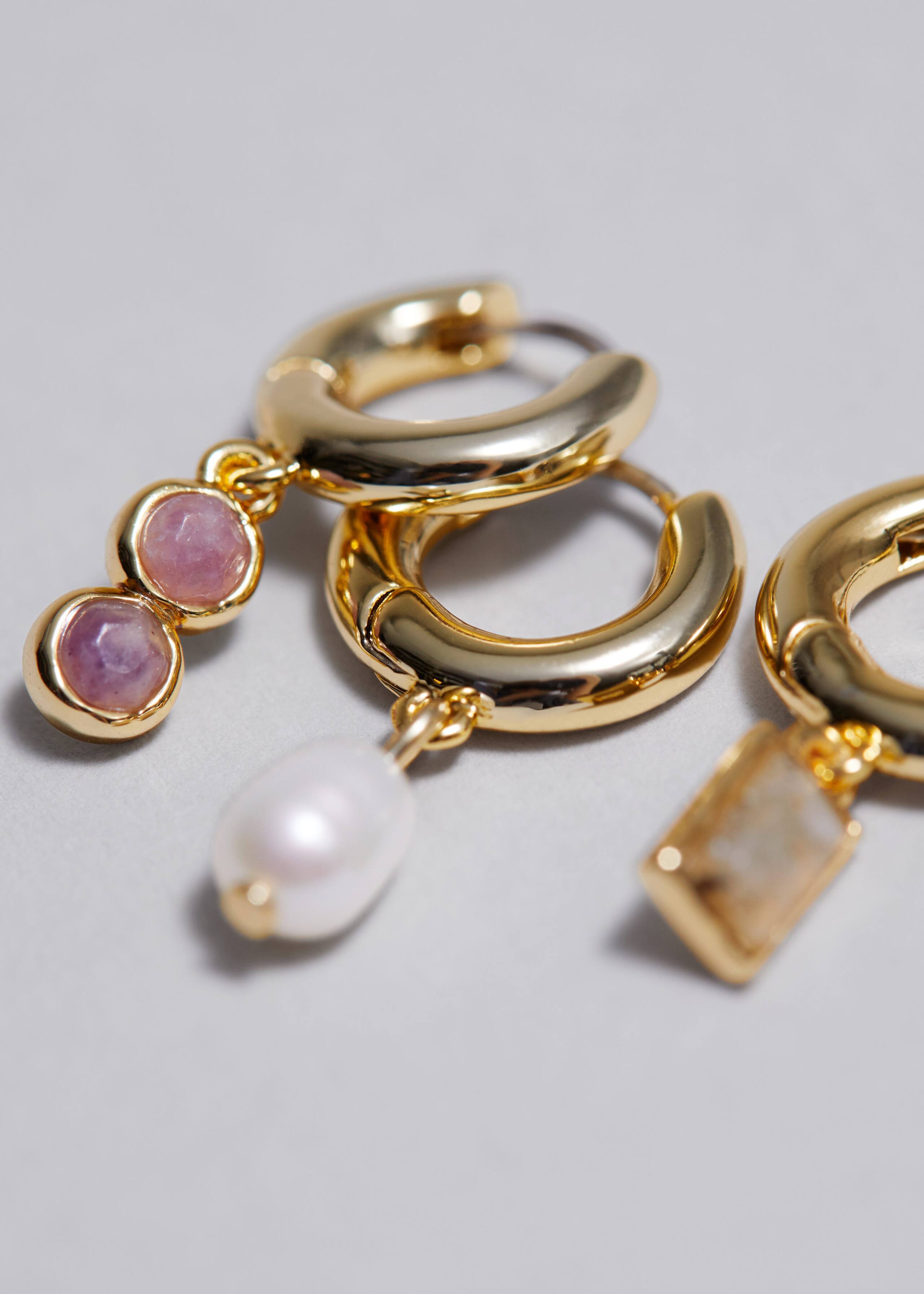 Three hoop earrings cast from brass, each with a a unique pendant. Finished with latch closures.