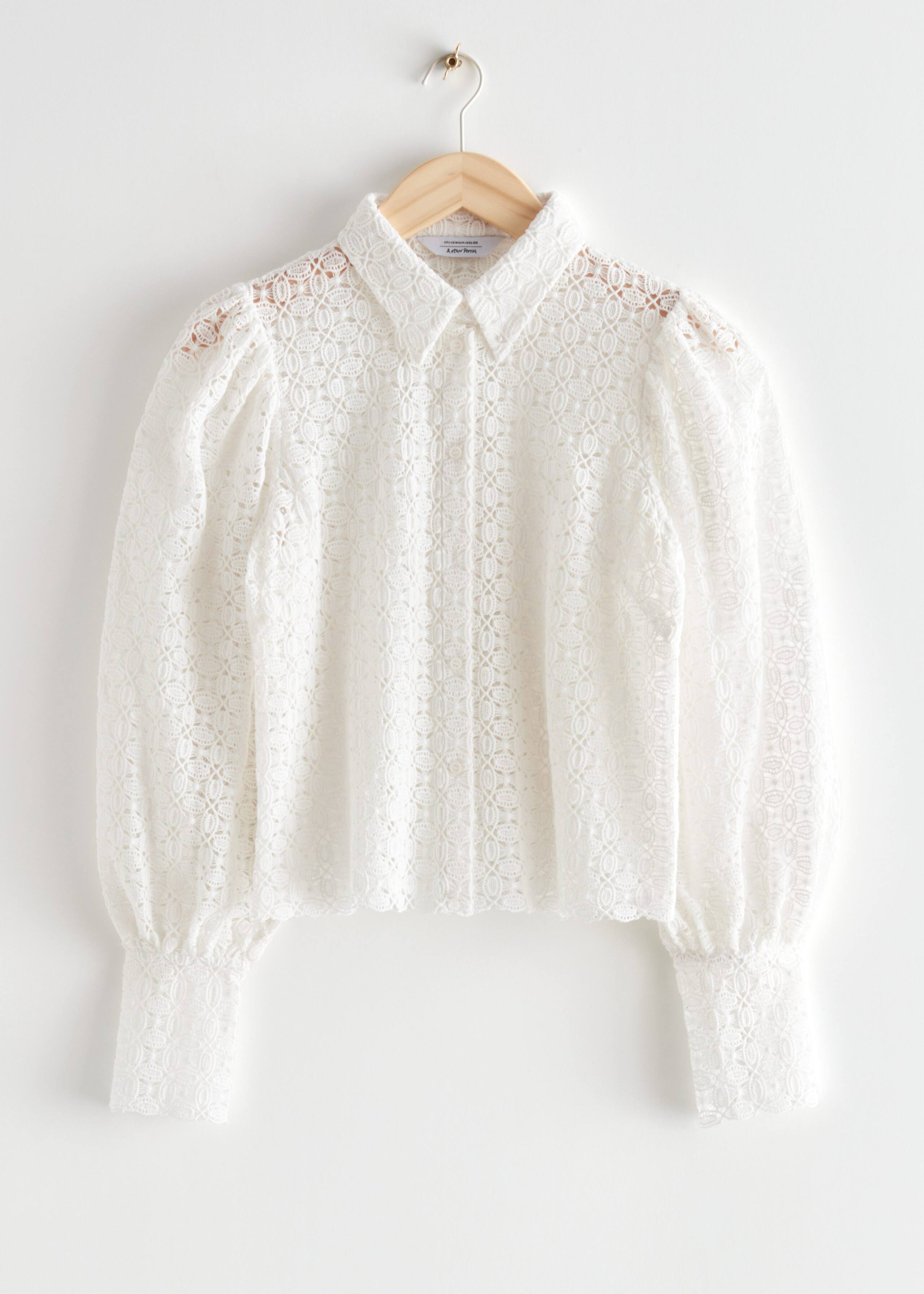 Lace blouse featuring relaxed sleeves and scalloped cuffs and hemline.