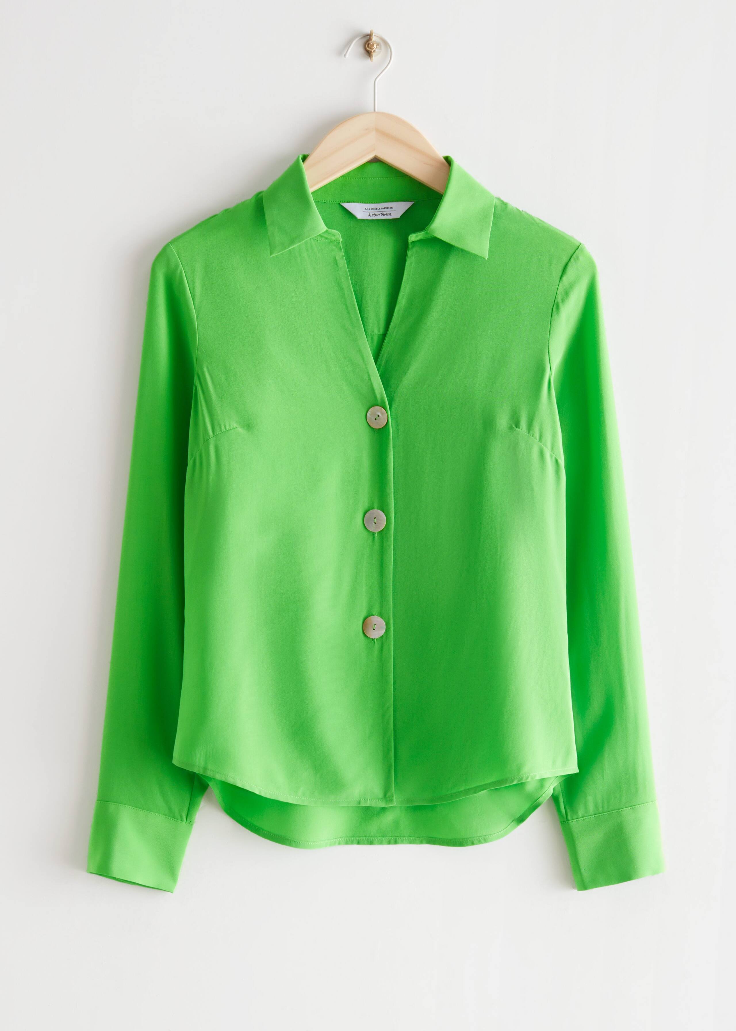 Relaxed mulberry silk blouse accented with shell buttons.