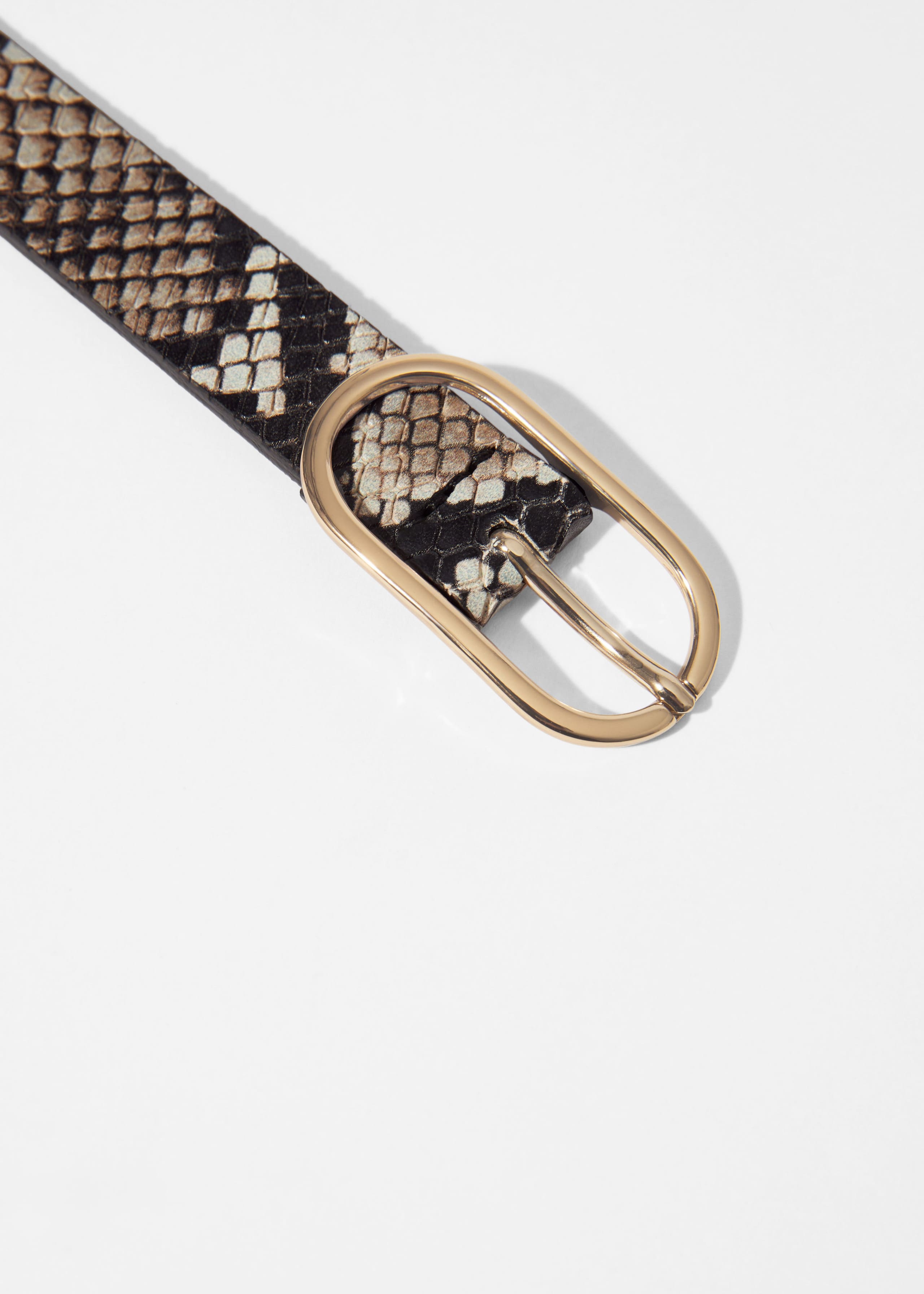 This slim belt is crafted in Italy from snake-embossed leather and fastens with an oval, gold-tone brass buckle. Loop yours through a pair of jeans or layer it over a blazer.