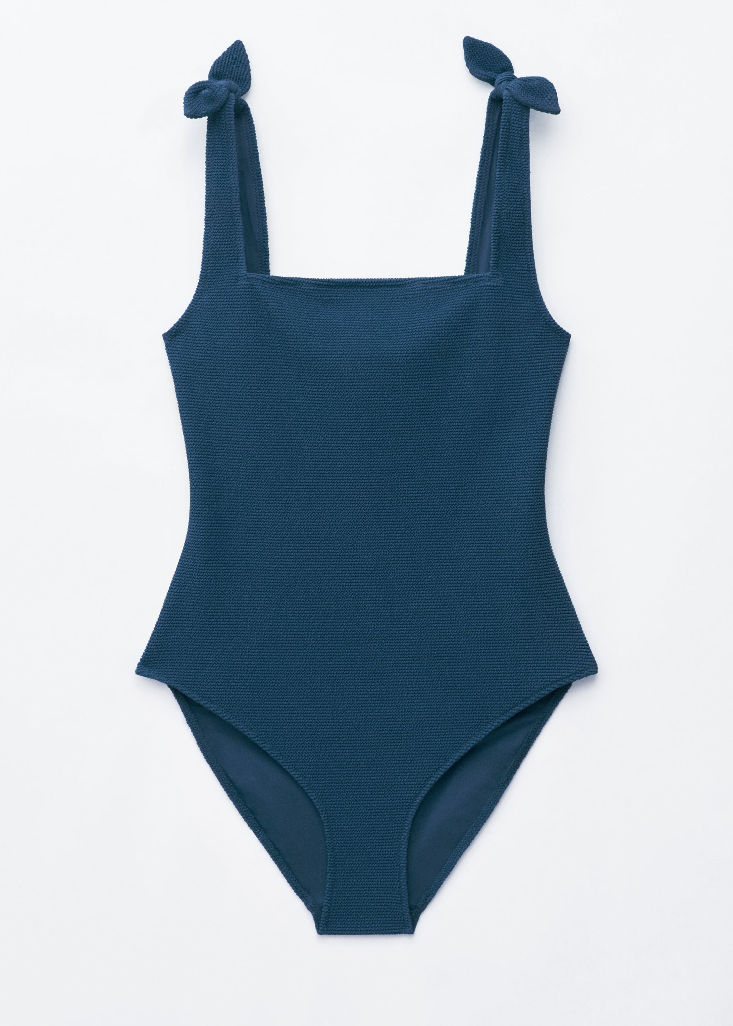 Textured one-piece swimsuit featuring decorative bow ties at the shoulders and a squared neckline.