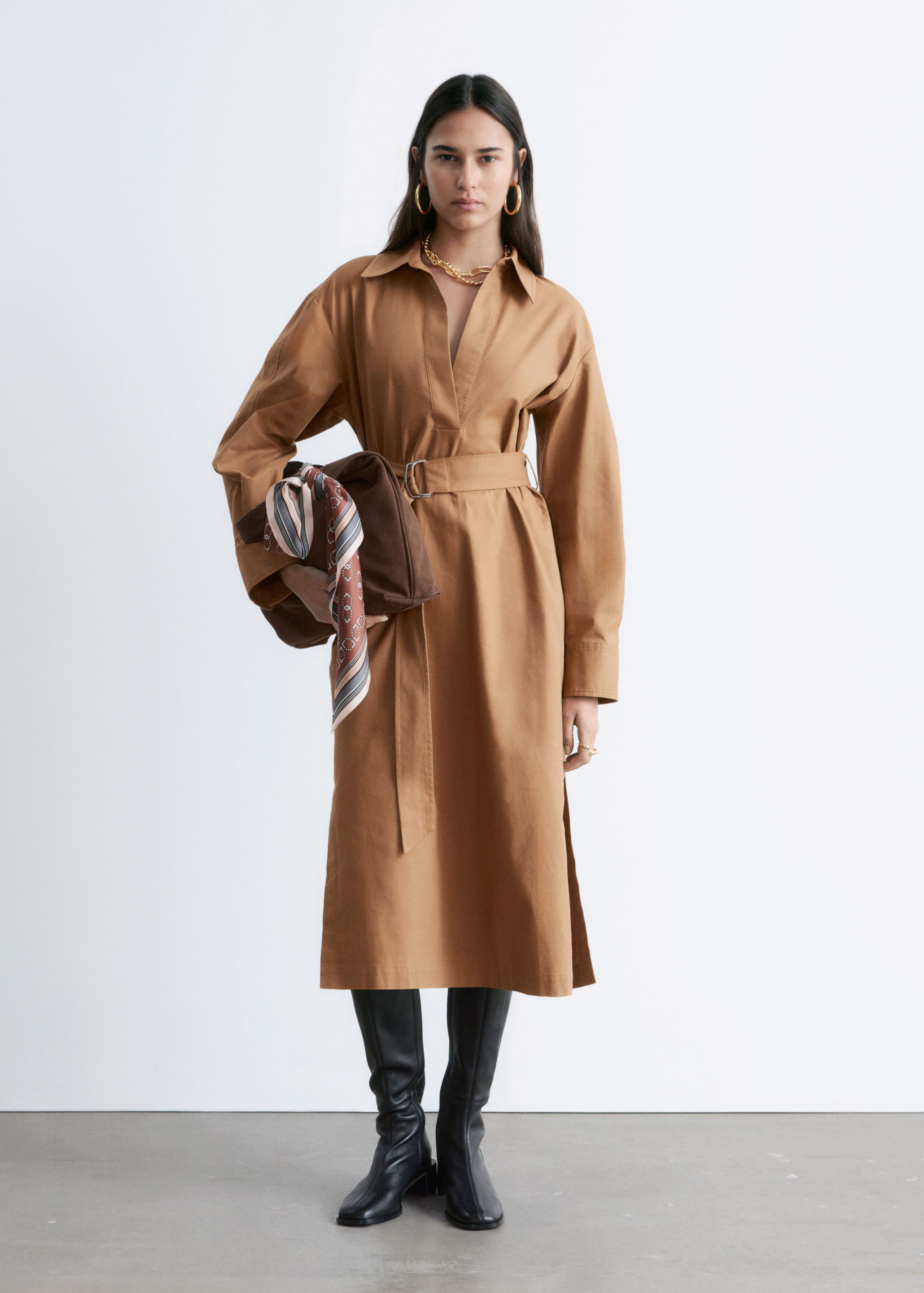Long-sleeve midi dress defined by clean lines and a subtle micro-floral pattern. It features a deep V-neckline with a delicate tie detail, and falls effortlessly over the body with a softly flared hem.