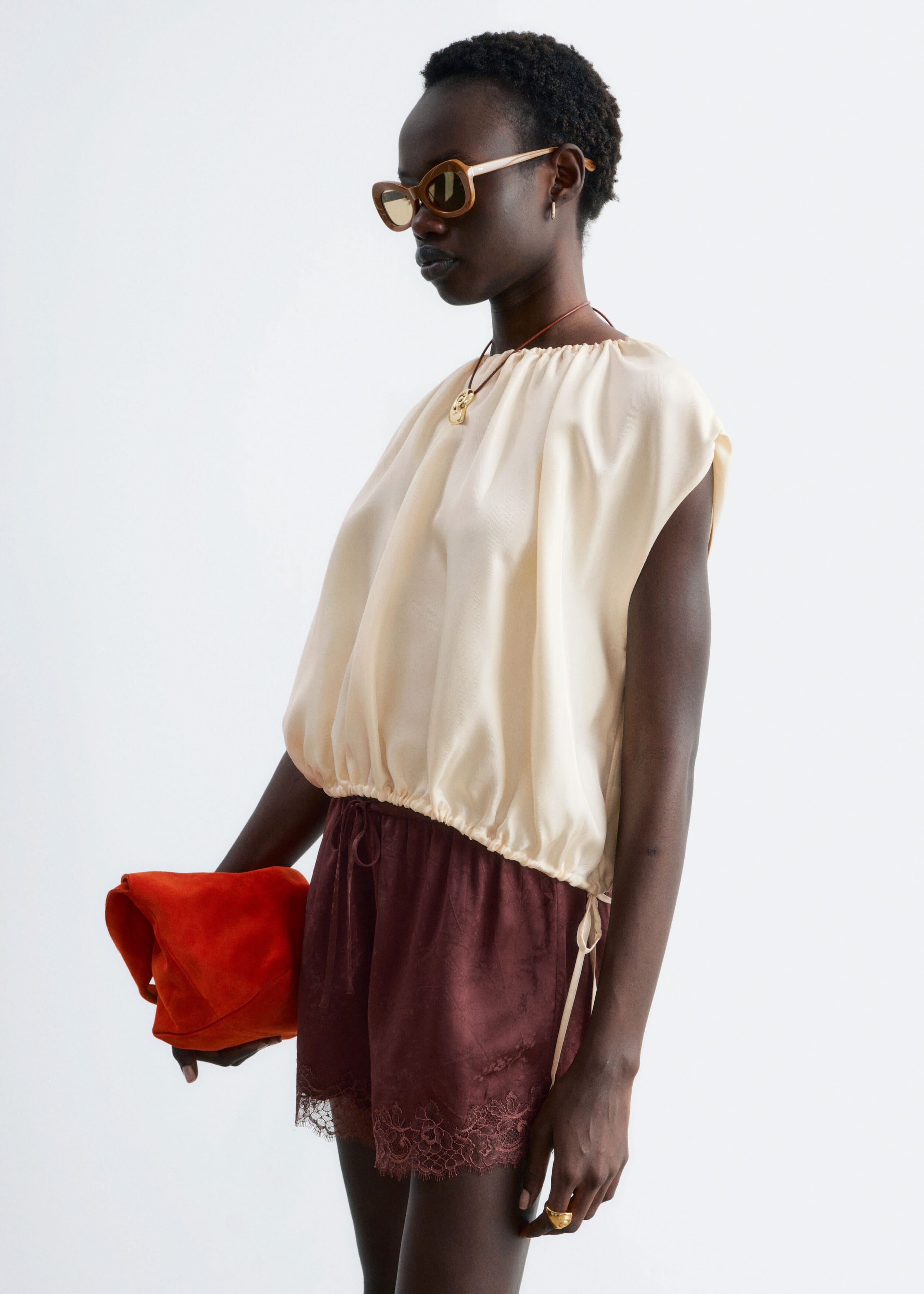 Balancing structure and femininity, this cotton denim blouse features a frilled collar, dropped shoulders, and voluminous sleeves that taper into buttoned cuffs. It’s detailed with topstitched seams and finished with tone-on-tone button closures. The rounded hem falls slightly longer at the back. It has an oversized fit. For a more tailored silhouette, consider sizing down.