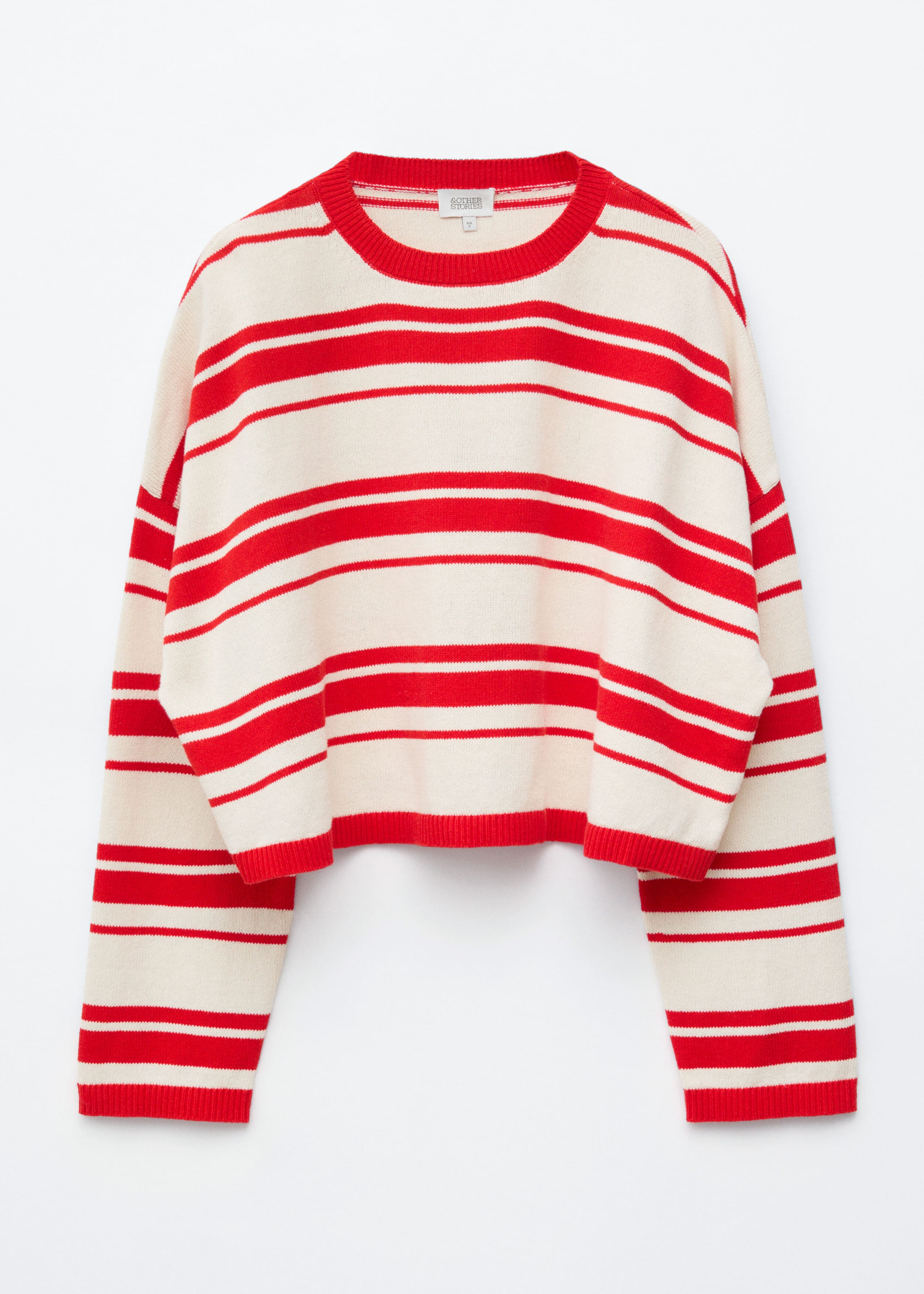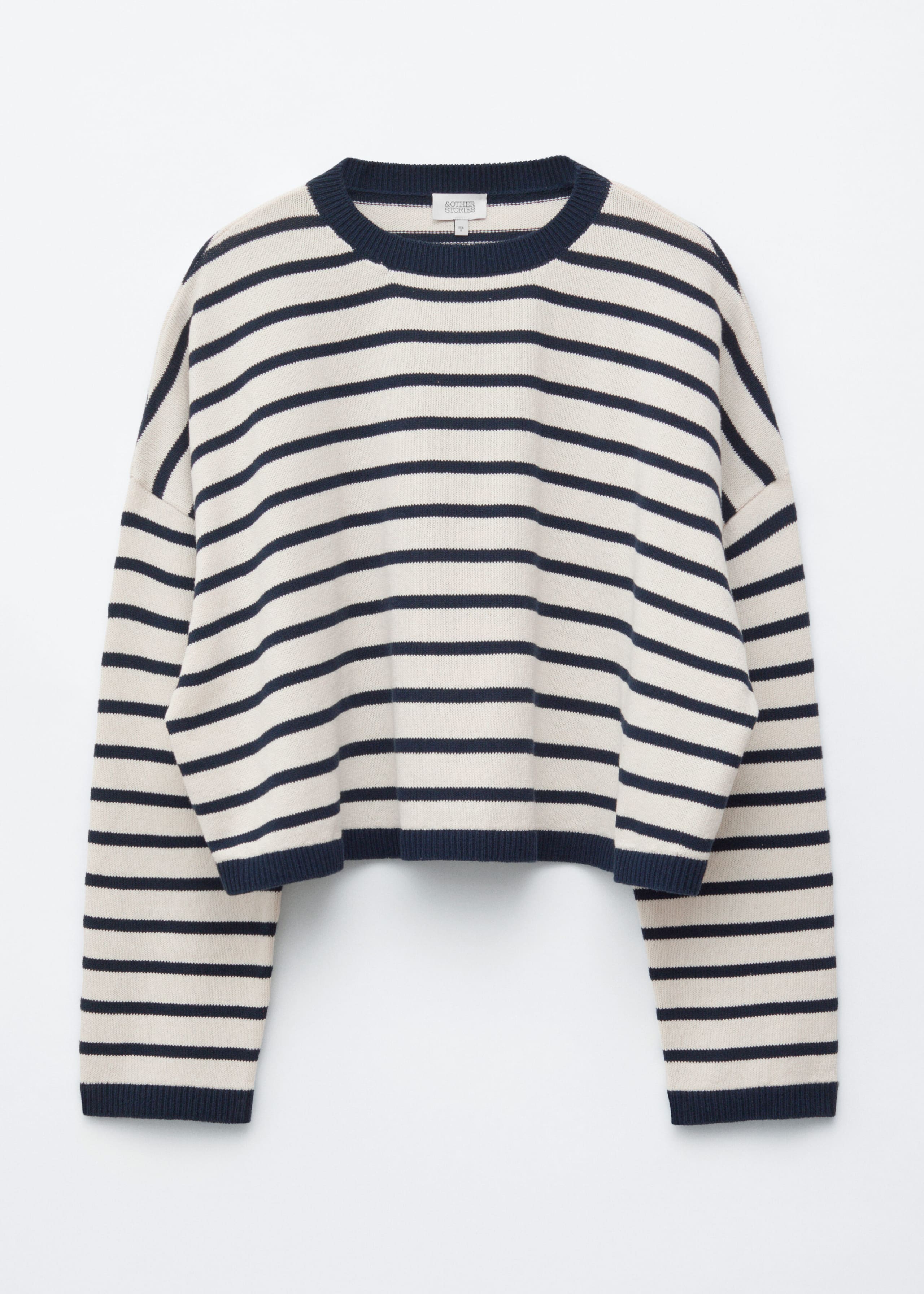 This sweater is knitted from a soft cotton-wool blend. Designed with a loose silhouette, it features a round neck, full-length sleeves, and ribbed trims. Wear as a standalone or as a layering piece during colder months.