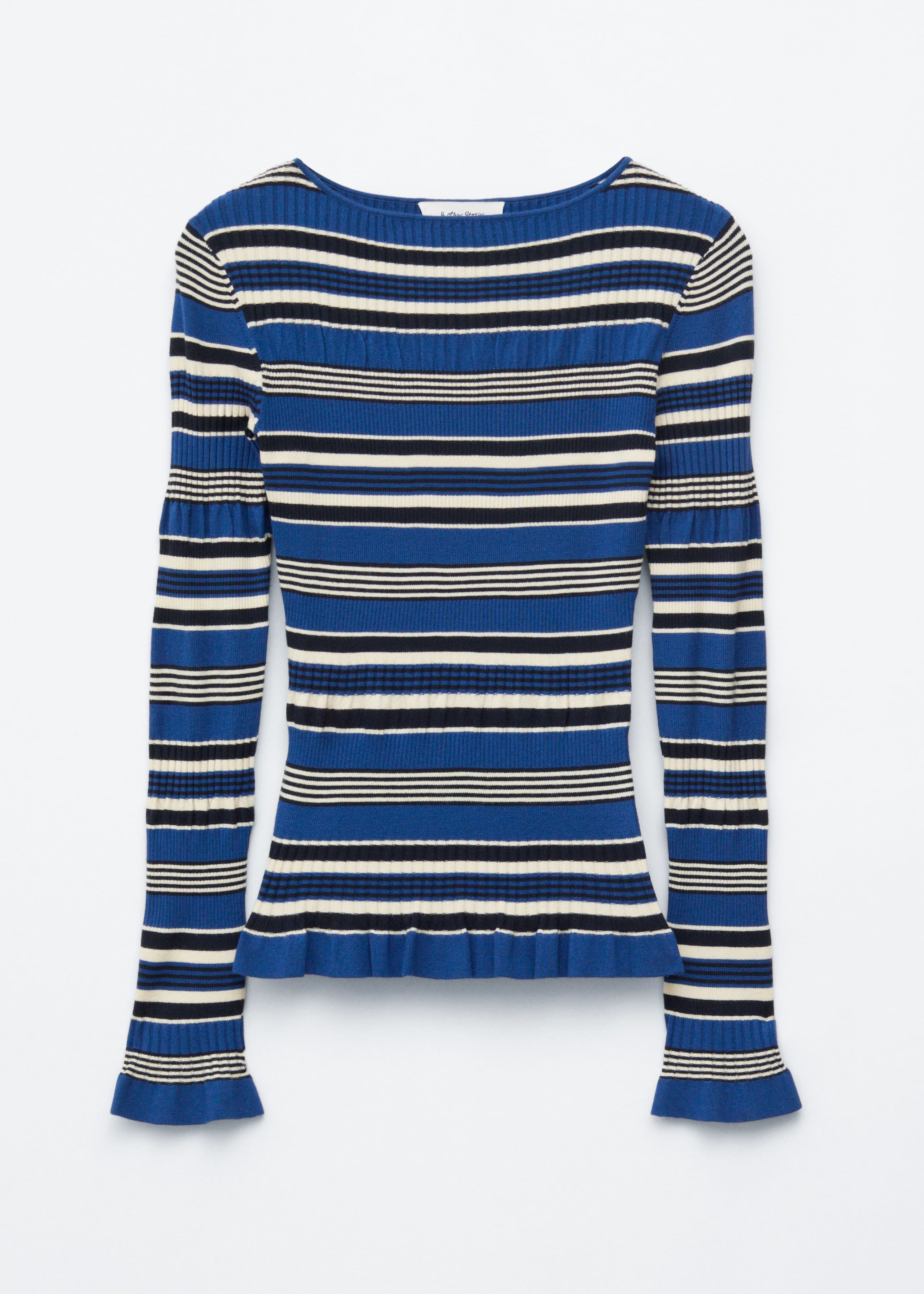 This long-sleeve top is cut in a slim silhouette with a stretchy, lightweight feel. It features rib variations, a wide neckline, and subtle frills at the hem and cuffs.