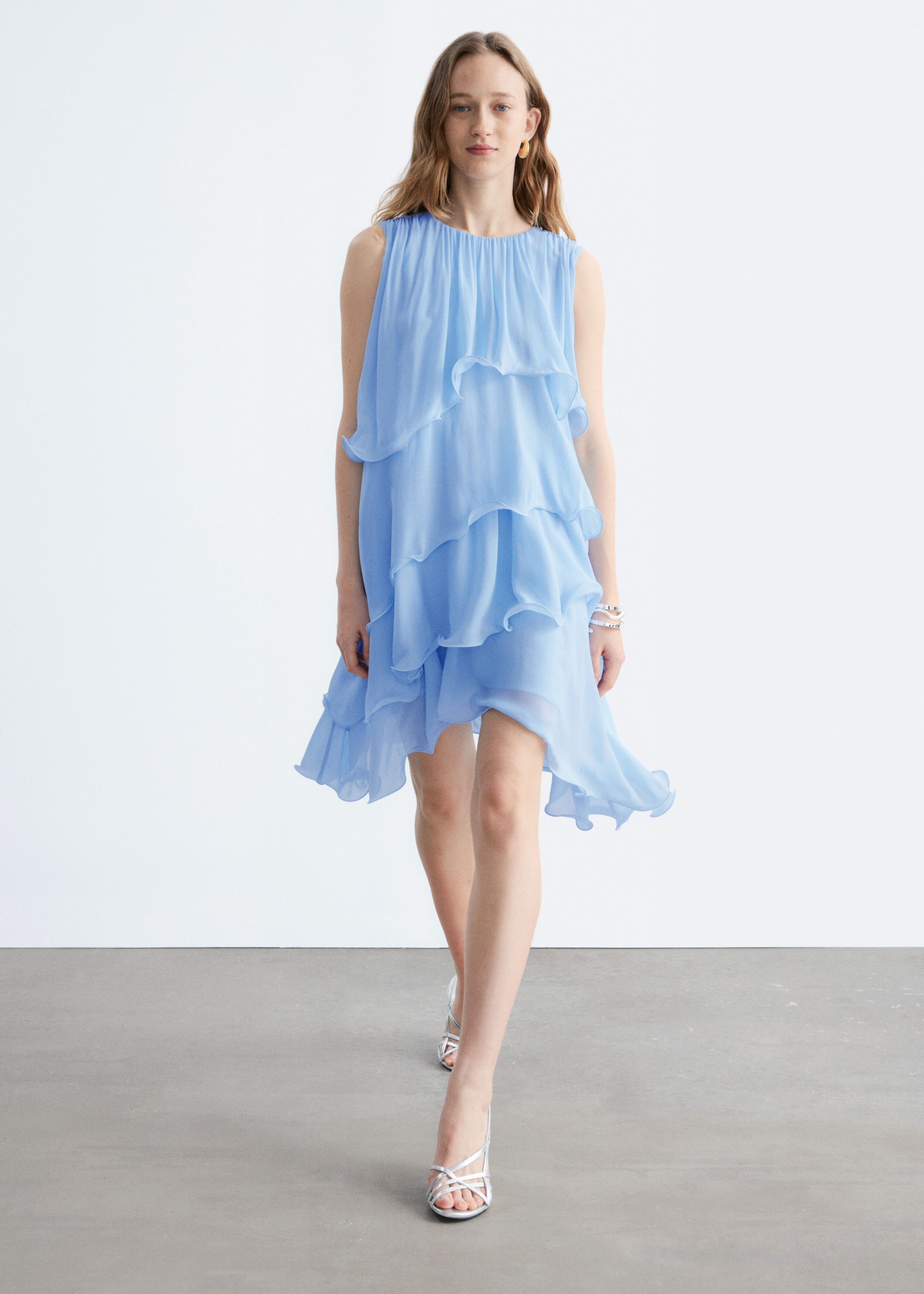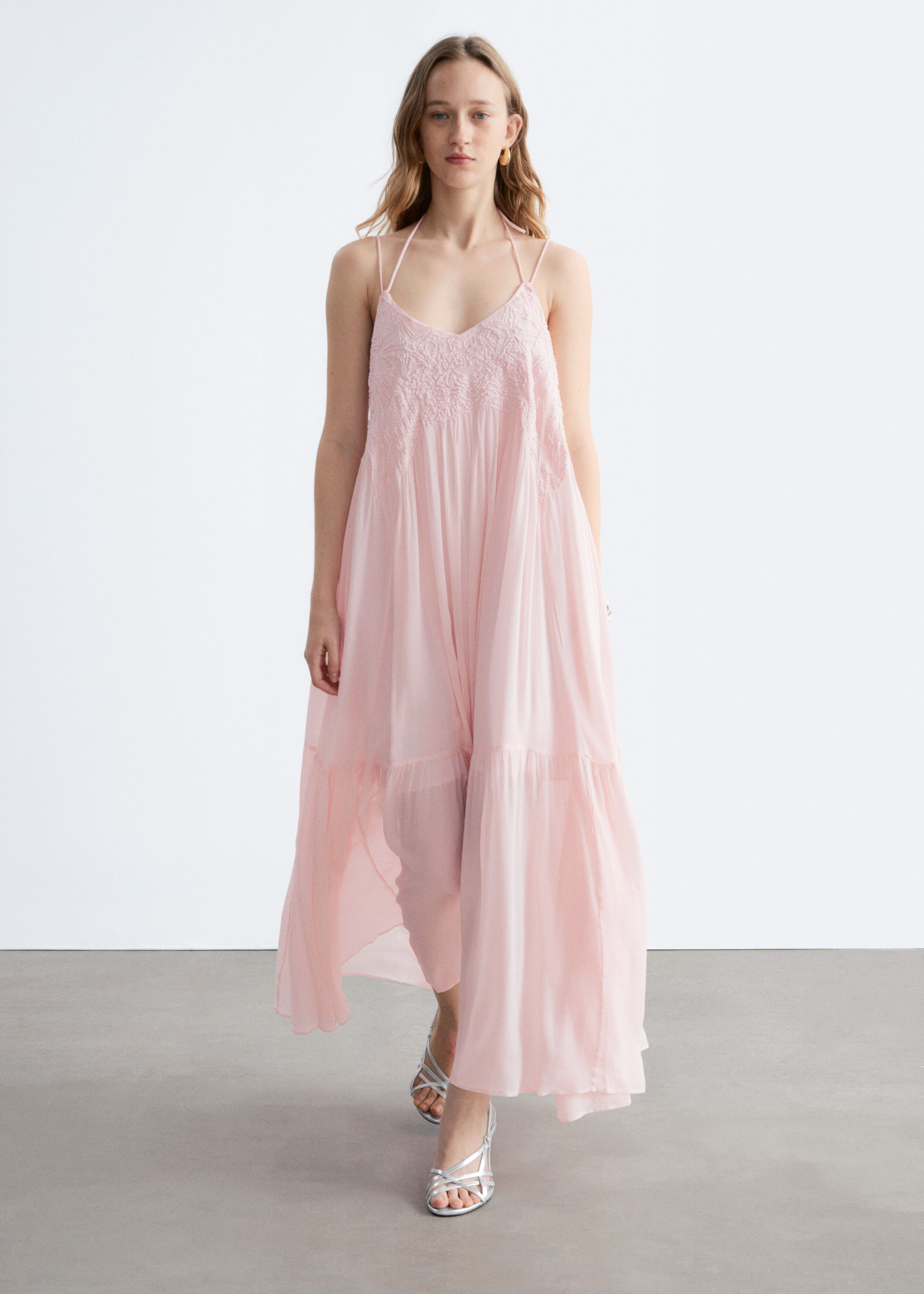 Cut in a fluid fabric, this midi dress features a straight silhouette that falls to mid-calf. Designed with a draped scarf neckline, softly flared sleeves, and subtle slits at the side hem. Finished with buttoned cuffs and a keyhole button closure at the neck.