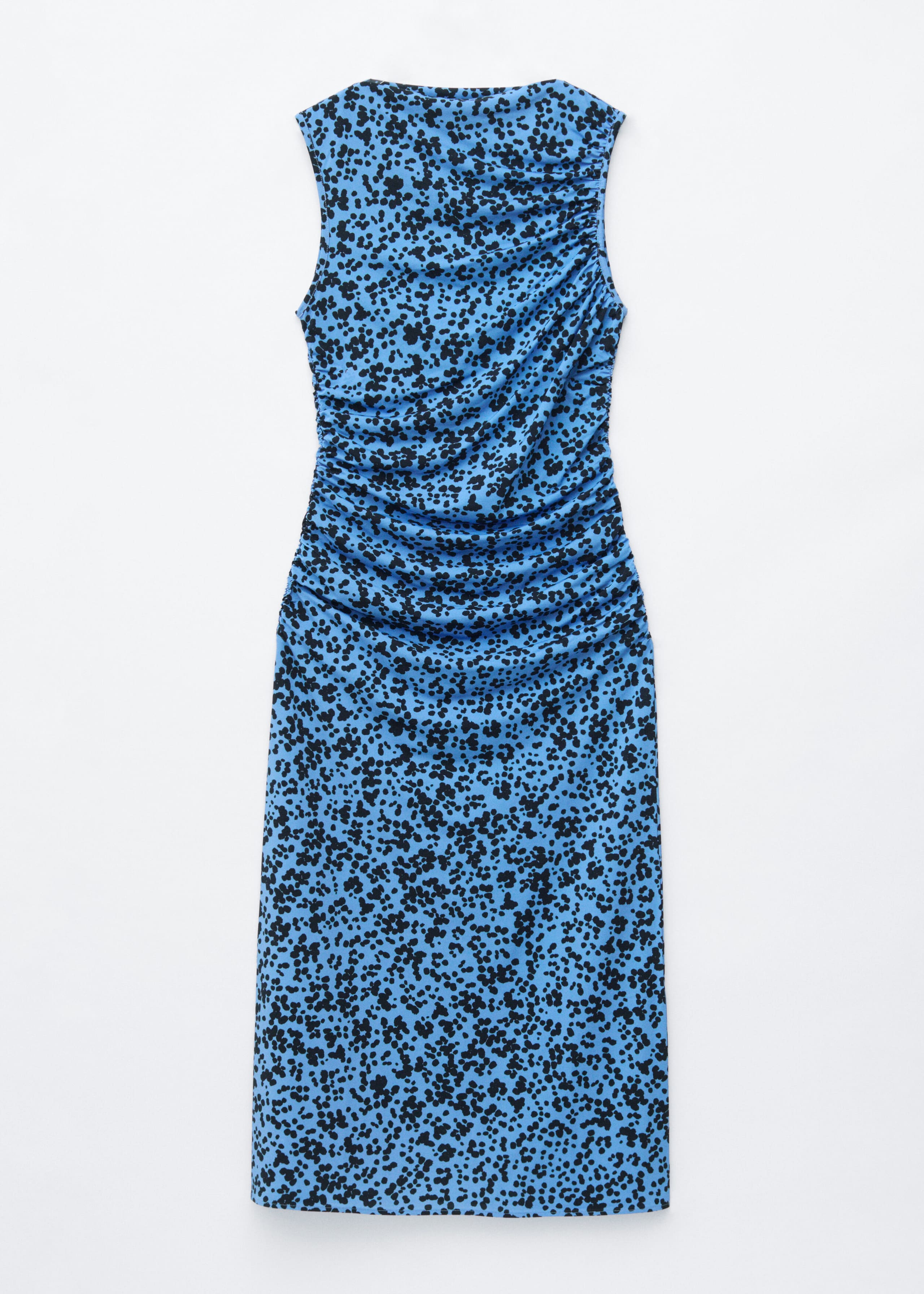 Clean lines meet subtle movement in this softly draped dress. The silhouette is shaped by a wrap front and short sleeves, while gathers at the side seams define the fit.