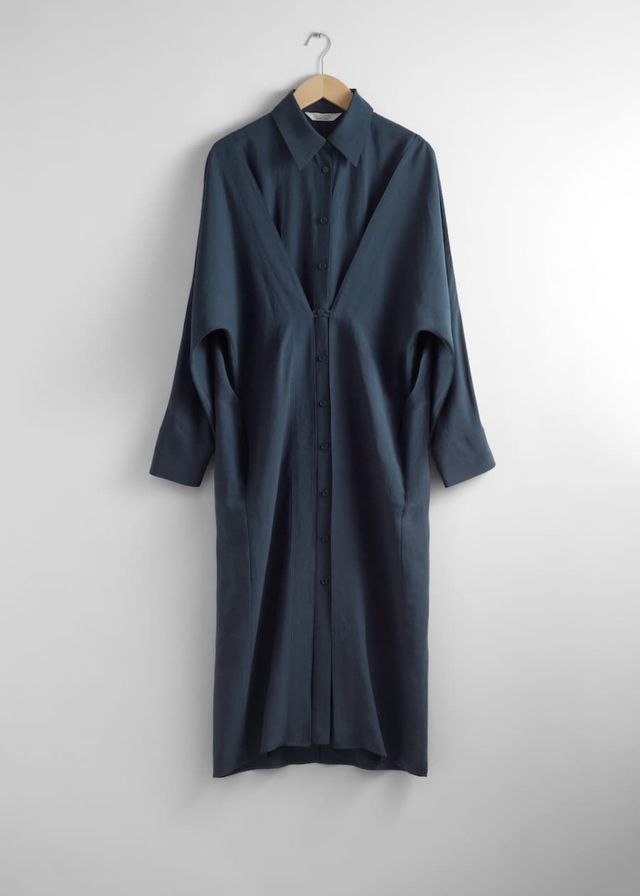 Collared shirt midi dress featuring waist loops that can be attached to a centre front button for a cinched silhouette.
