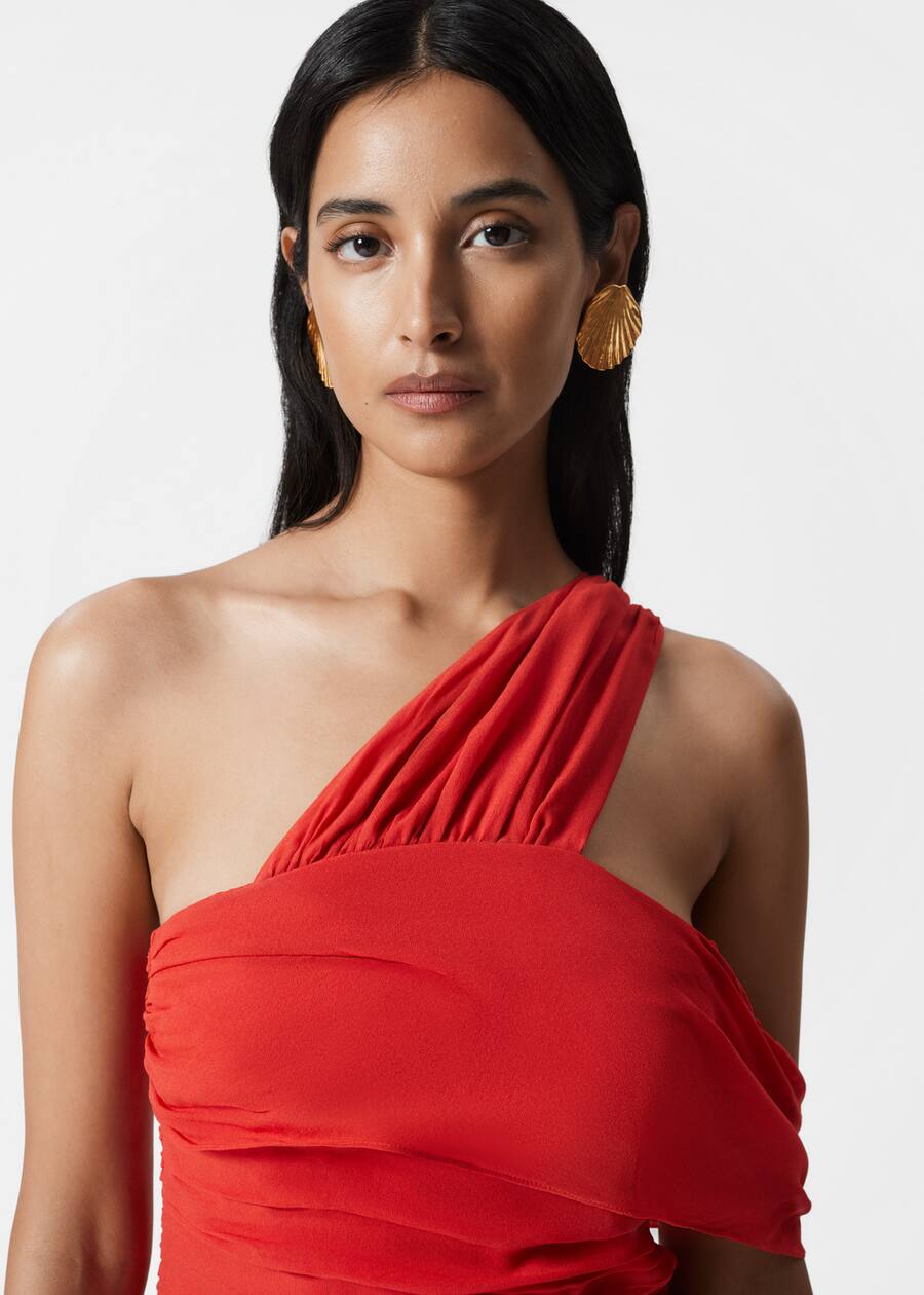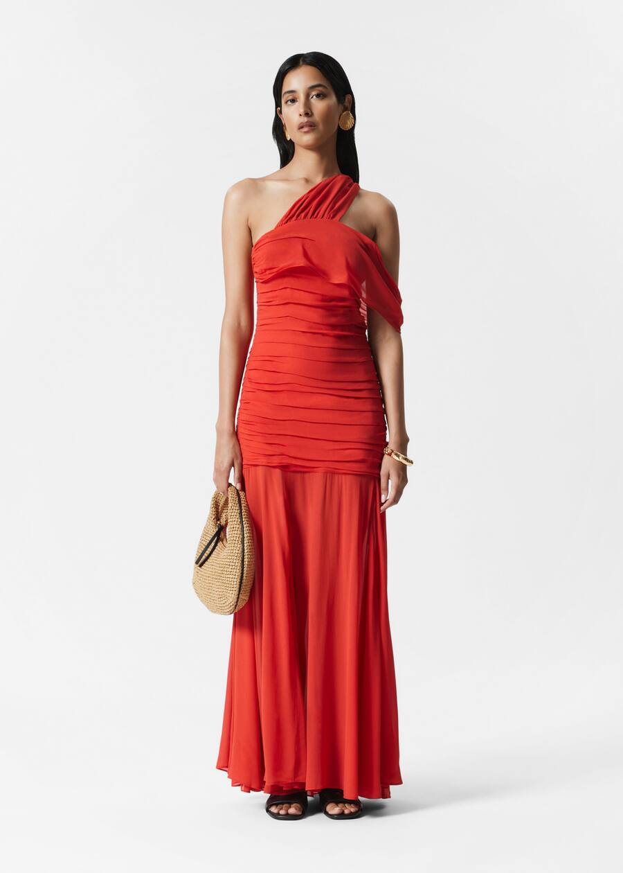 This floor-length maxi dress is crafted from a lightweight chiffon fabric. Designed with an asymmetric one-shoulder neckline, it features a fitted bodice with gathered pleats. The semi-sheer skirt falls into a fluid, A-line silhouette with subtle draping for added movement. Finished with a concealed side zipper. Pair it with strappy heels and a clutch for warm-weather occasions.