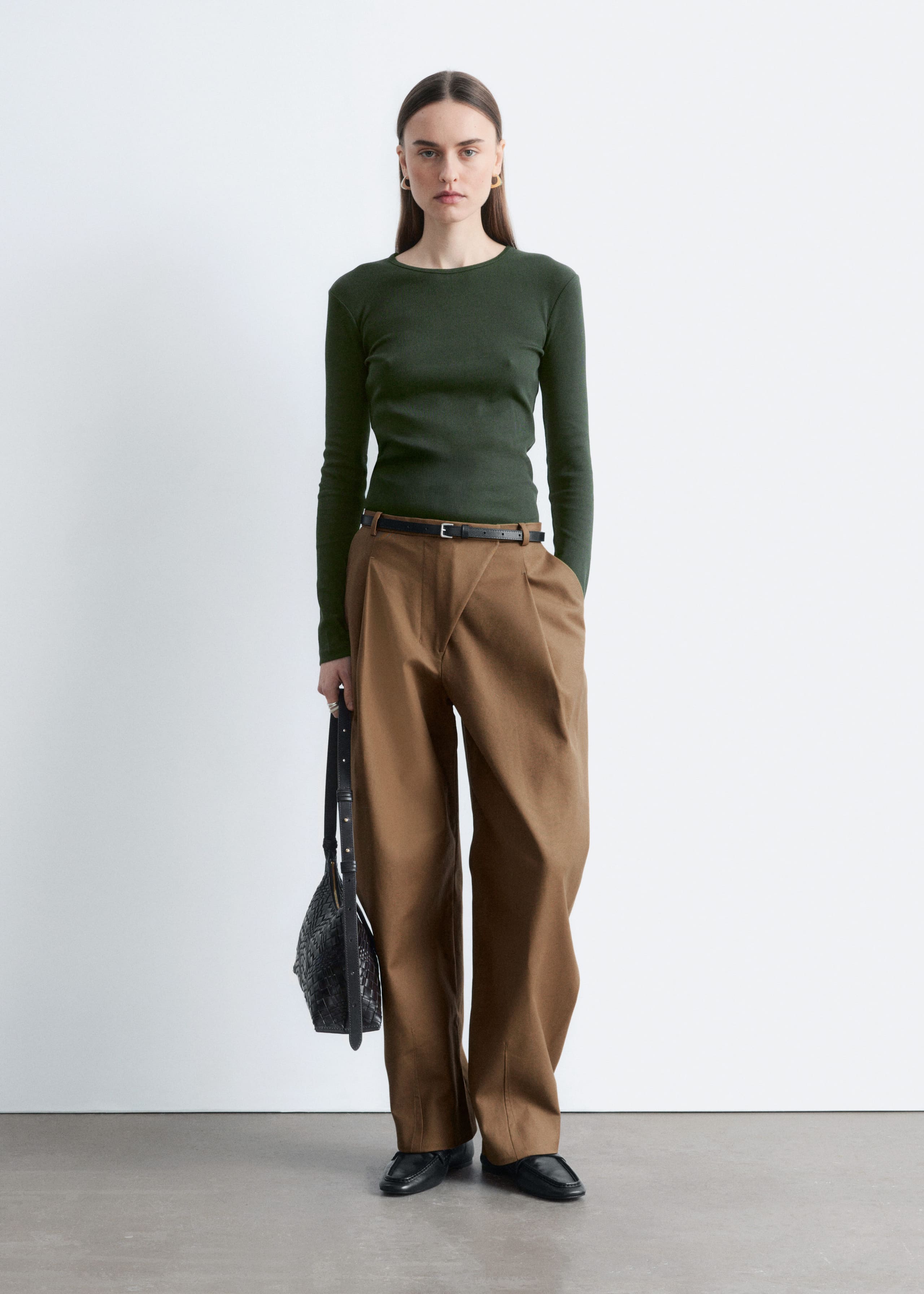 Jersey t-shirt designed with a deep scoop neck, a fitted waist, and short, wide sleeves. Featuring topstitched seams along the front and back for a decorative touch.