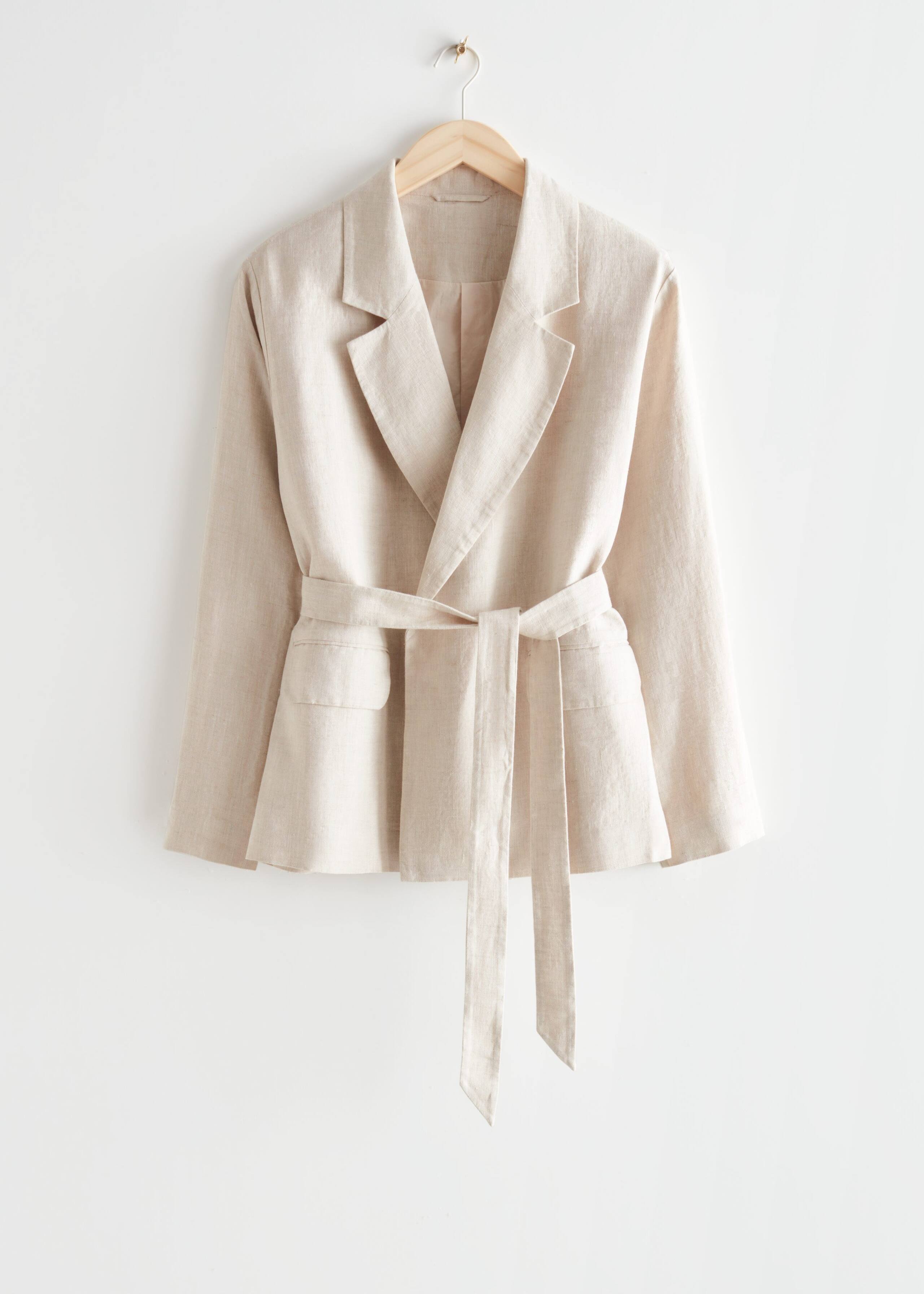 Relaxed linen blazer featuring a tuxedo collar and a tonal self-tie belt.