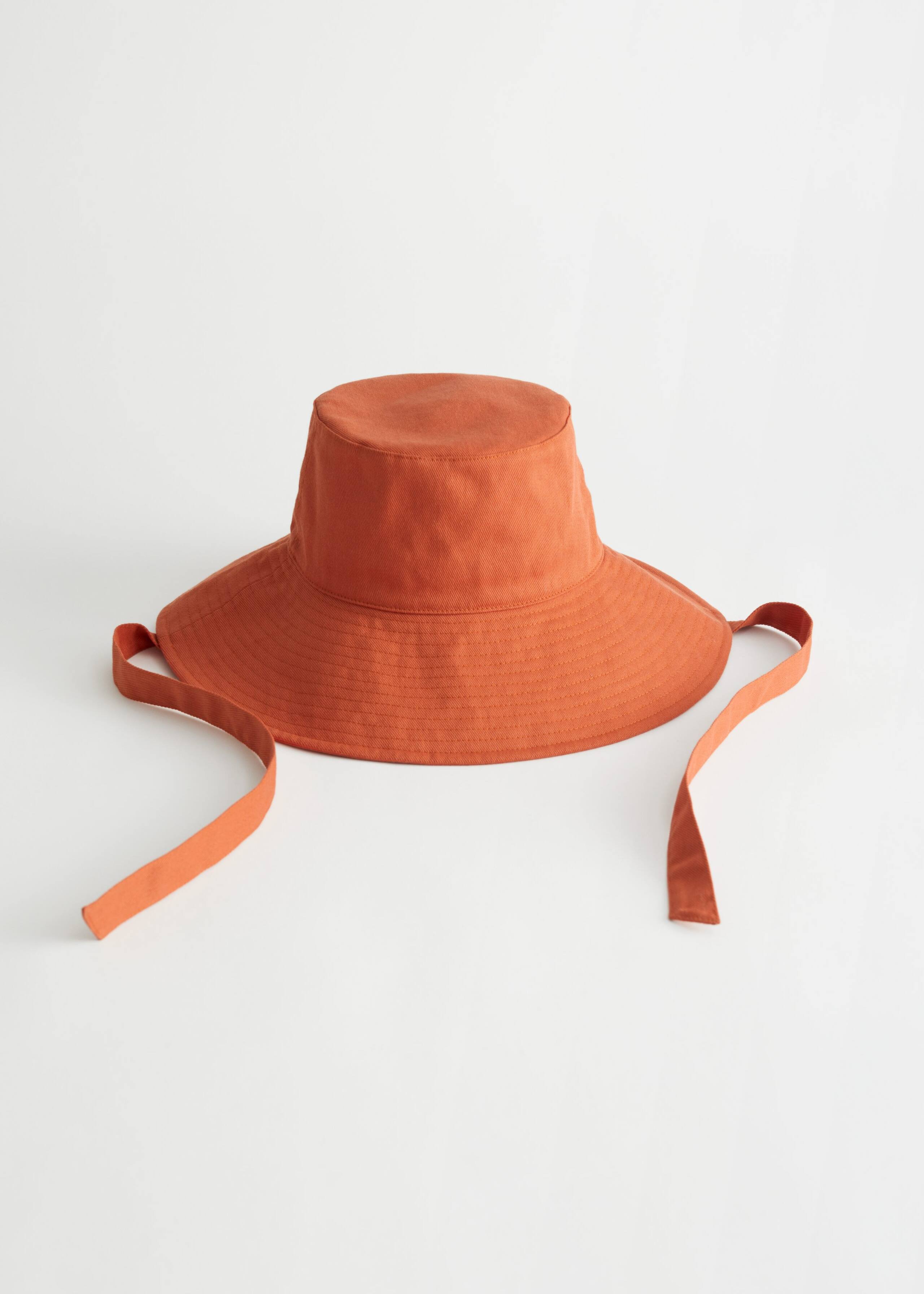 Bucket hat featuring a stitched brim and an adjustable tie ribbon.
